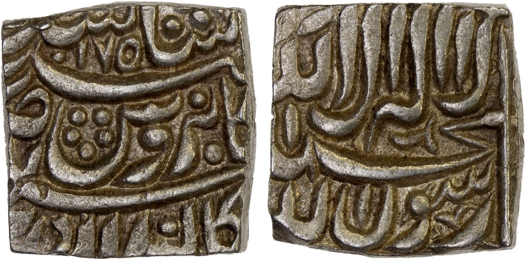 MUGHAL: Akbar I, 1556-1605, AR square rupee (11.29g), Bangala, AH1017, KM-86.1, posthumous issue with the "Kabe Roshan" couplet, rare date, with 3 banker's marks on the edge, lovely XF-AU, R.