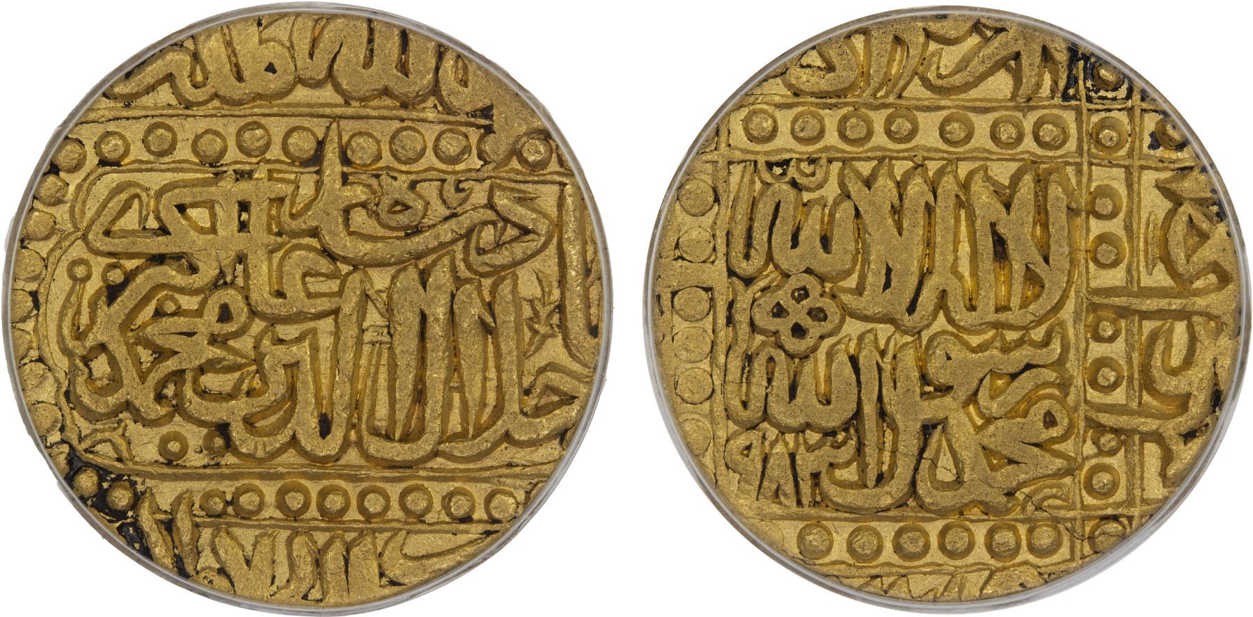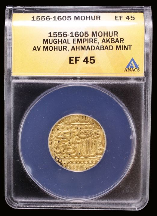 MUGHAL: Akbar I, 1556-1605, AV mohur, Ahmadabad, AH983, KM-108.2, elongated lozenge // plain square, pelleted borders around both fields, ANACS graded EF45.