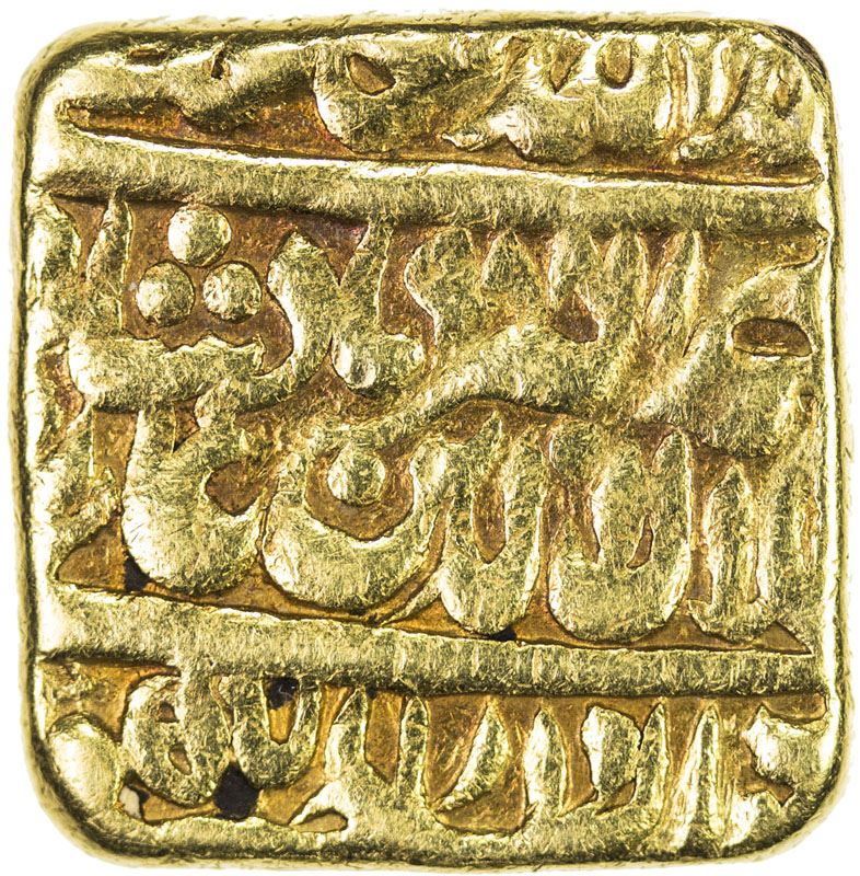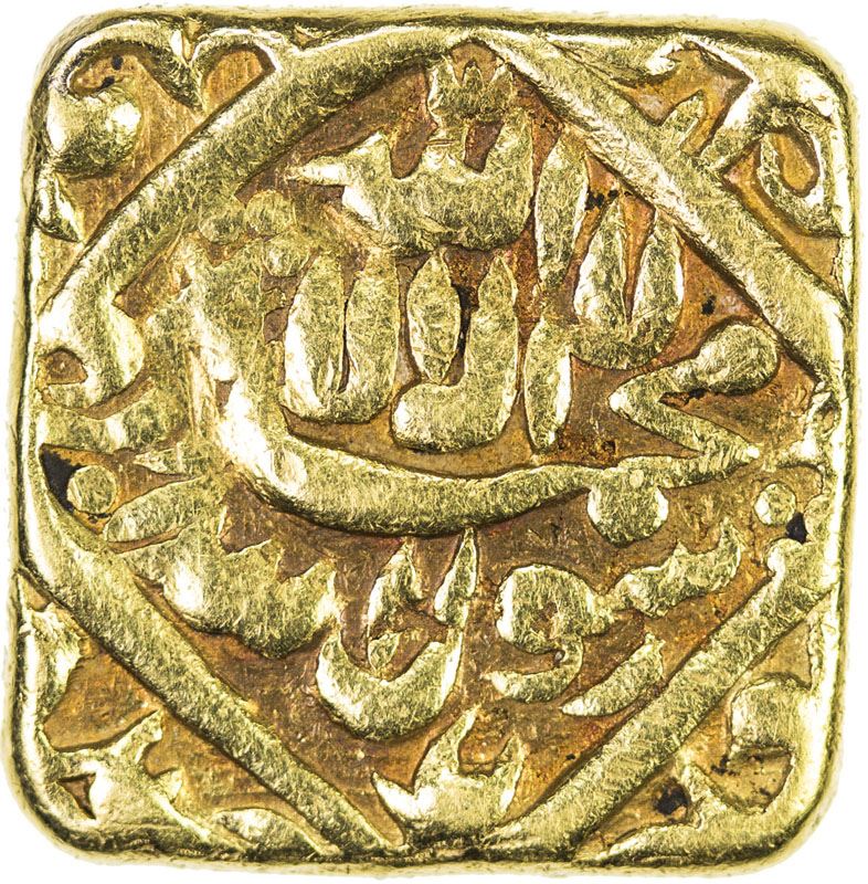 MUGHAL: Akbar I, 1556-1605, AV square mohur (11.39g), "Lahore", AH"988", KM-112.2 type, later good-luck imitation, probably 18th or early 19th century, Fine.