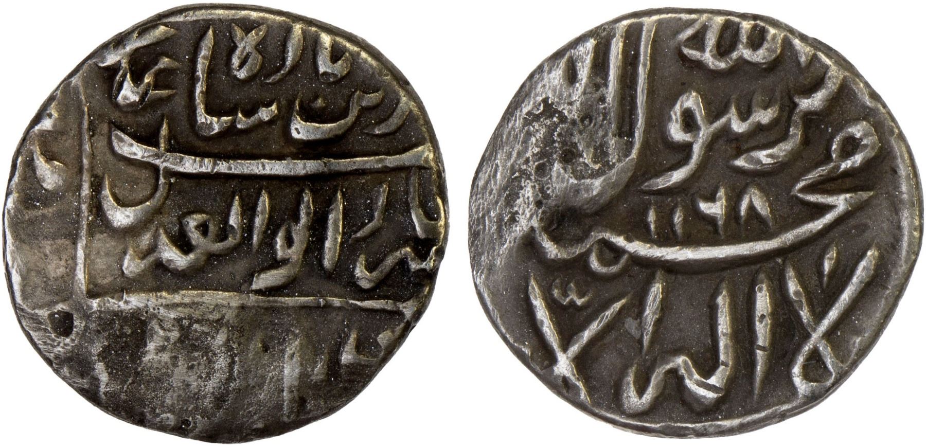 MUGHAL: Alamgir II, 1754-1759, AR 1/8 rupee (1.33g) (Shahjahanabad), AH1168, KM-B452.x, complex square // square design; with all legends and arrangements identical to the full rupee type A-455.2, with traces of the mint name Shahjahanabad still visible; mount removed; unpublished and unique, VF, RRRR. For Alamgir II, the only mints thus far reported for the 1/8 rupee are Murshidabad and Azimabad, both of very different designs.