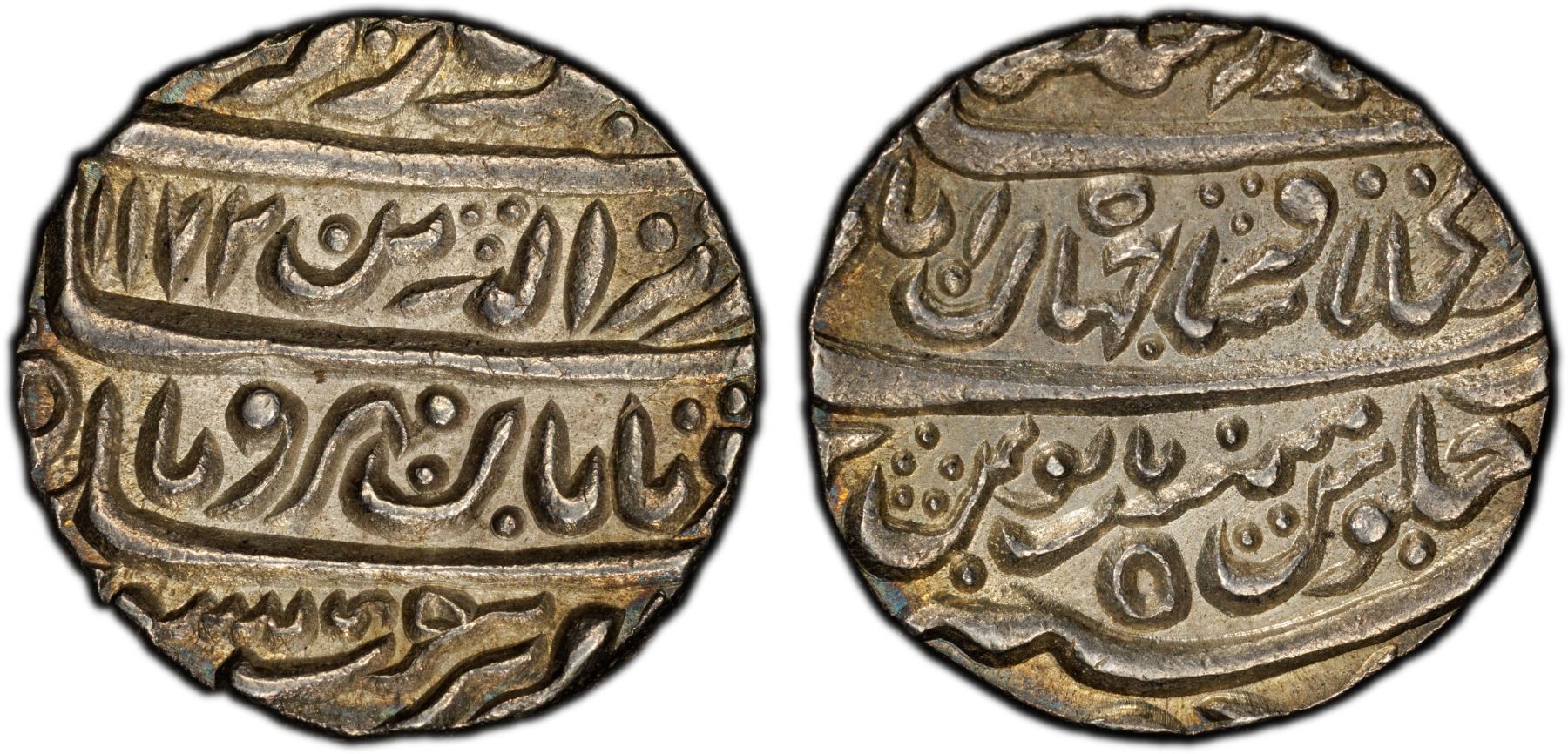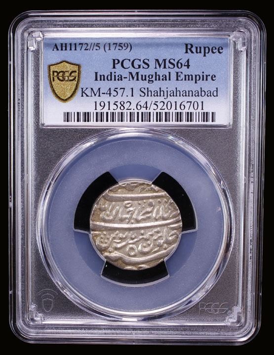 MUGHAL: Alamgir II, 1754-1759, AR rupee (11.42g), Shahjahanabad, AH1172 year 5, KM-457.1, superb bold strike, a wonderful mint state example! PCGS graded MS64.