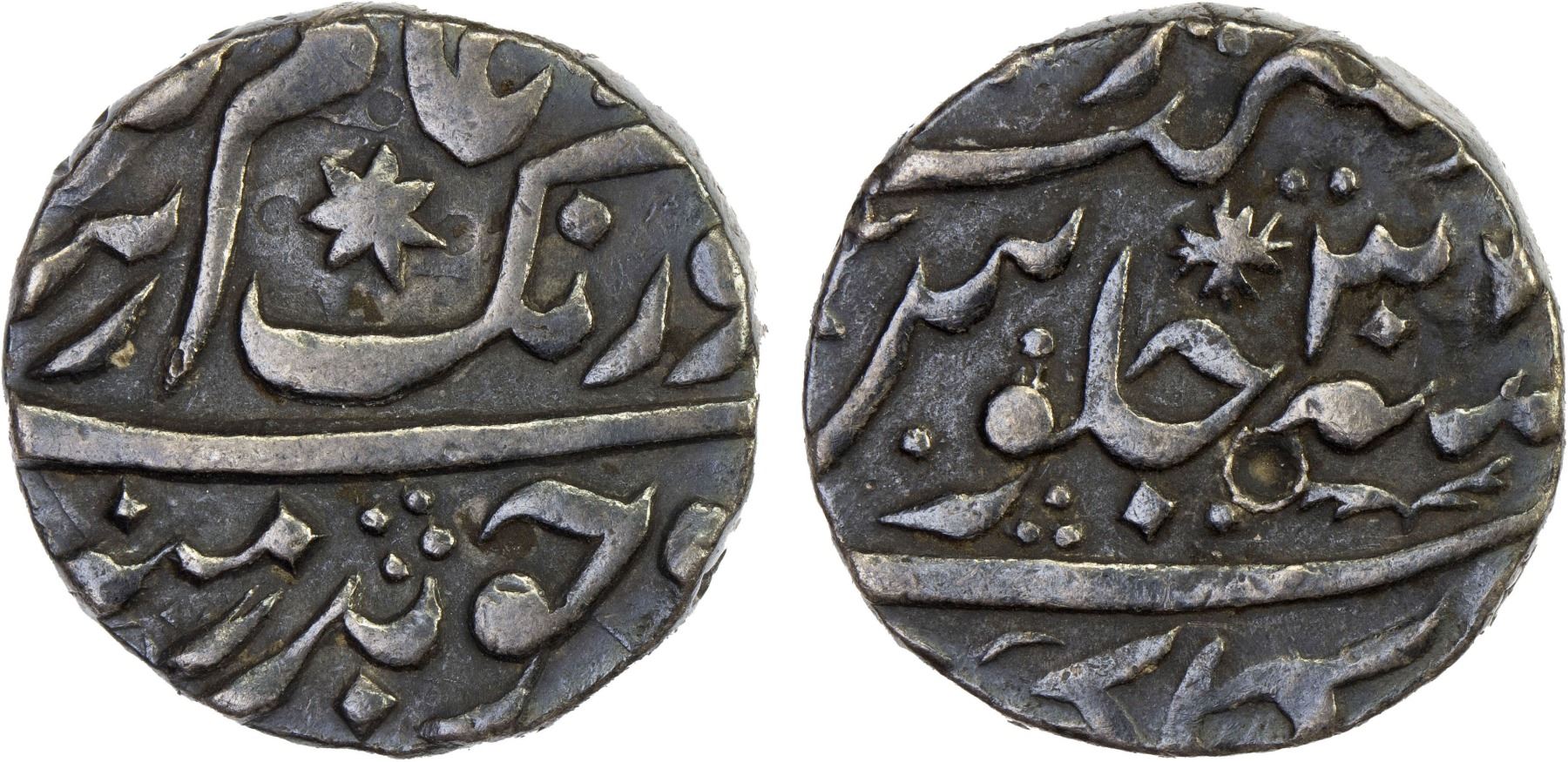 MUGHAL: Aurangzeb, 1658-1707, AR 1/2 rupee (5.71g), Gulkanda, year 30, KM-294.3, star on both obverse & reverse, 1 testmark, very rare denomination for Gulkanda, choice VF, RR.