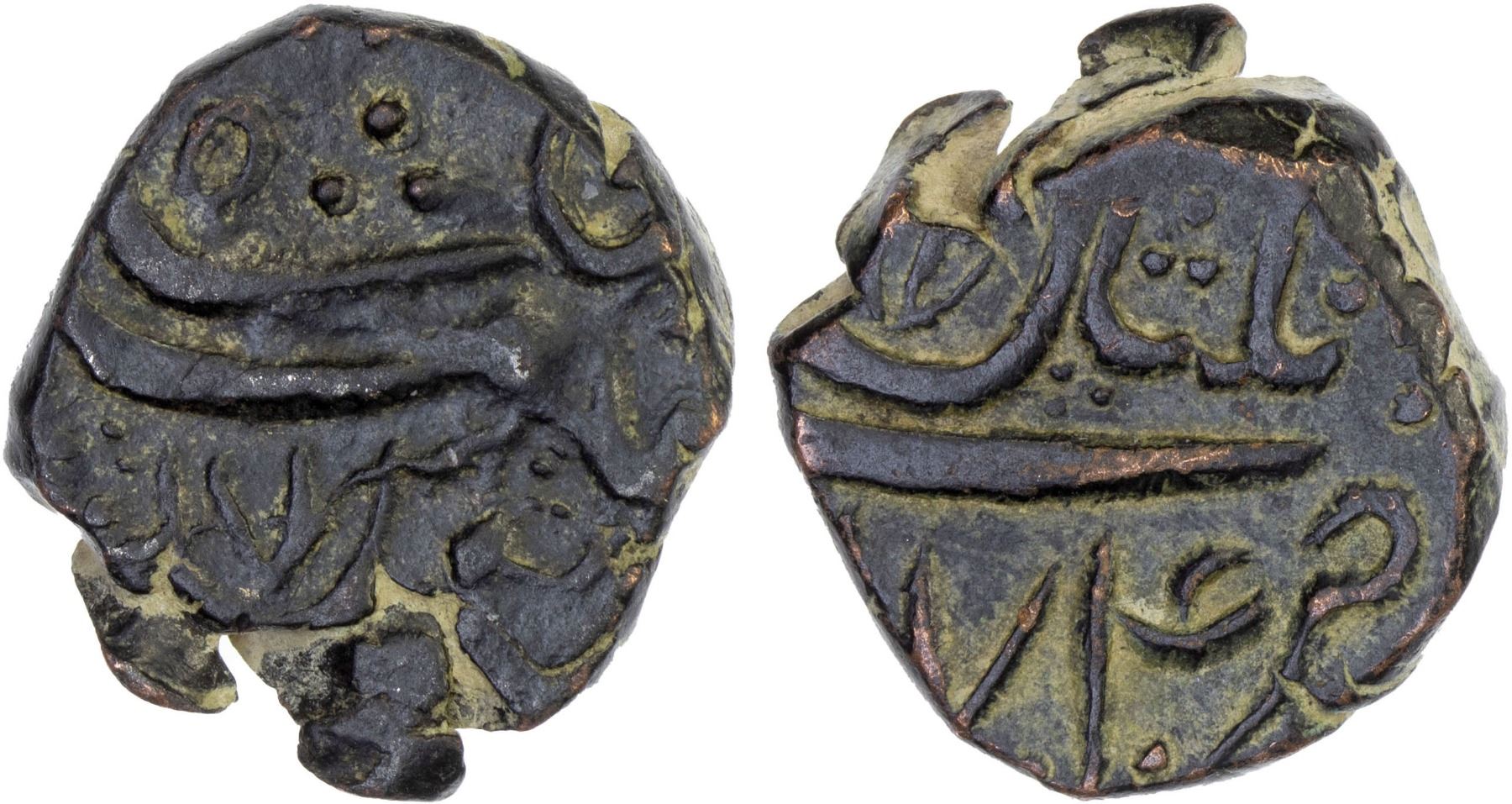 MUGHAL: Aurangzeb, 1658-1707, AR 1/4 falus (7.04g), Multan, AH(10)74, cf. Zeno-169047 dated AH(10)73, and 292739 dated (10)75, double-struck on the obverse, XF, RRR. Zeno-169047 clearly shows the name Aurangzeb.