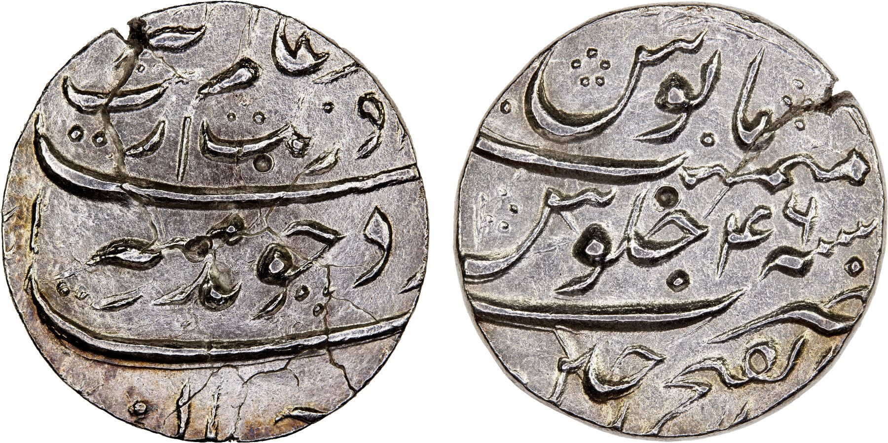 MUGHAL: Aurangzeb, 1658-1707, AR rupee (11.19g), Ujjain, year 46, KM-300.91, with mint epithet Dar ul-Fath, planchet cracks, shroff mark, XF.