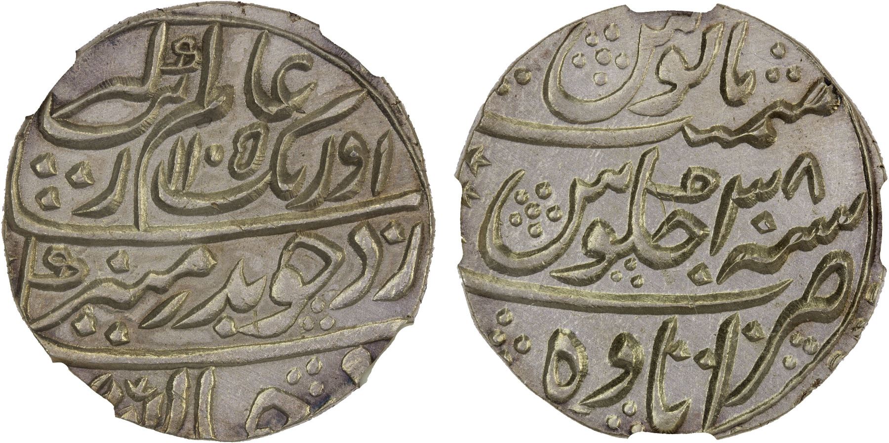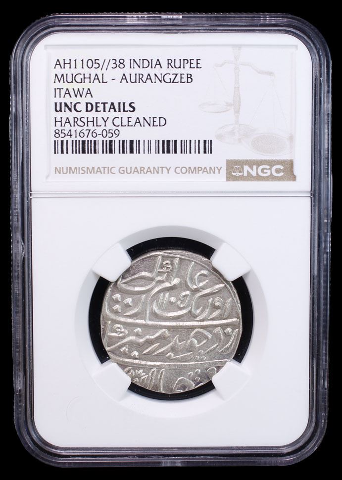 MUGHAL: Aurangzeb, 1658-1707, AR rupee, Itawa, AH1105 year 38, KM-300.39, wonderful bold strike; harshly cleaned (actually not so bad!), NGC graded UNC details.