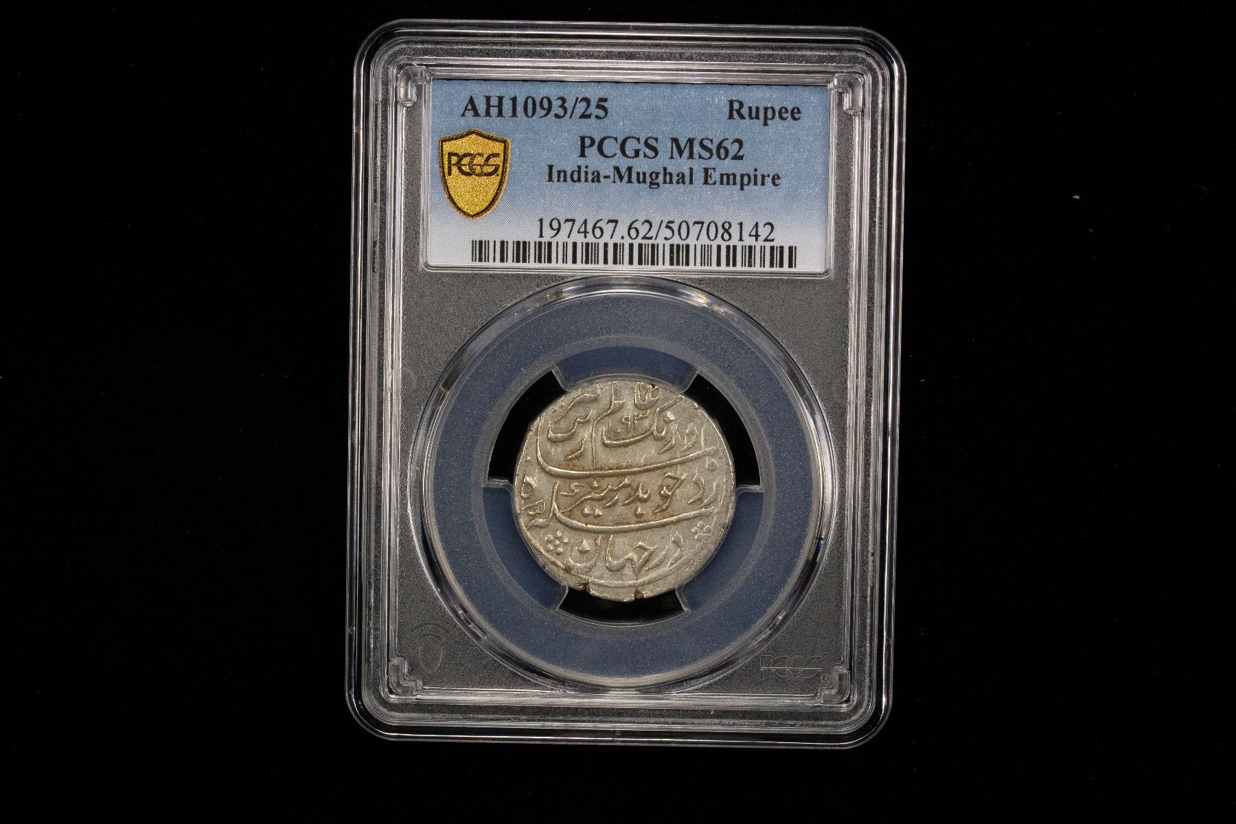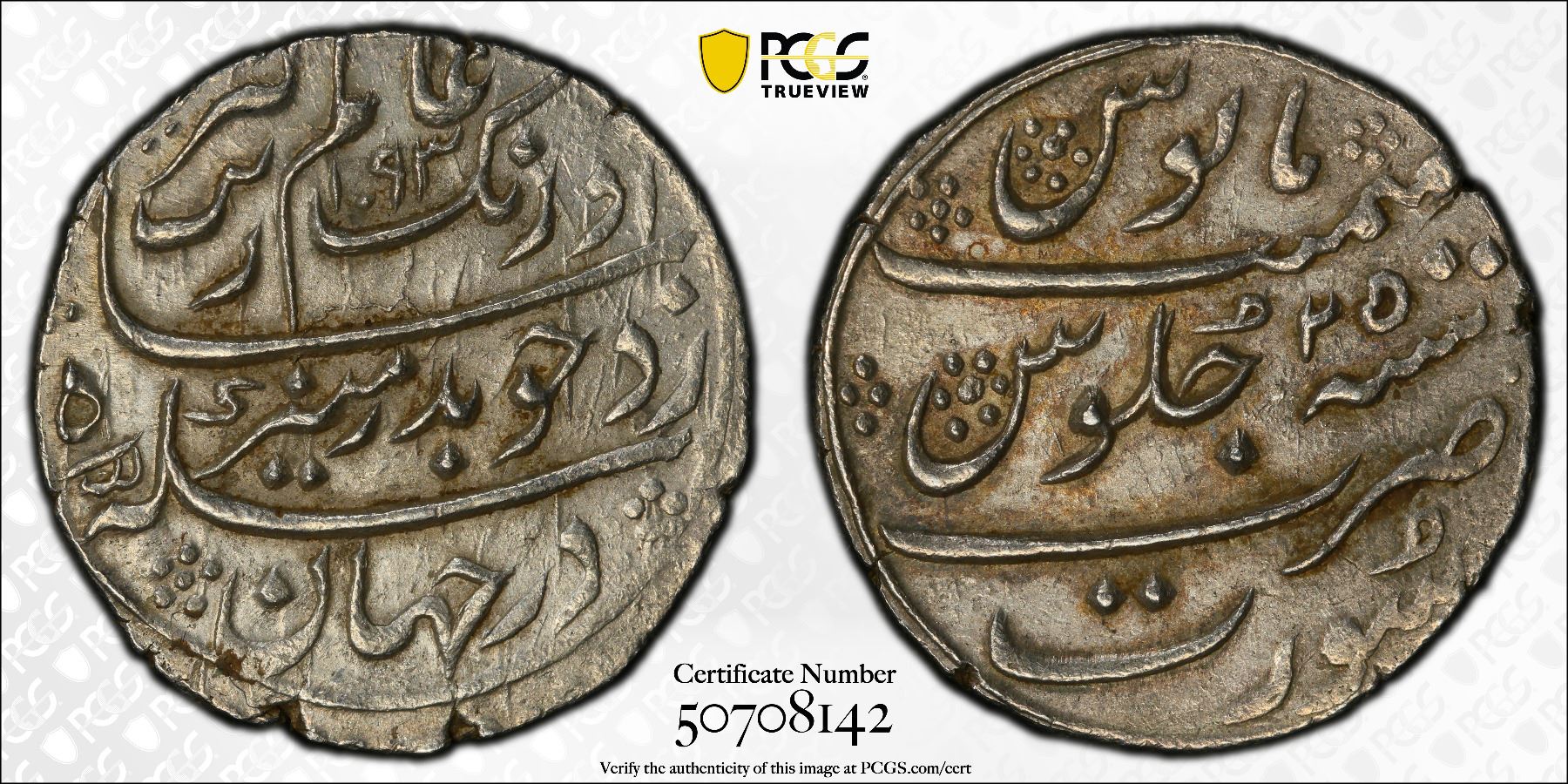 MUGHAL: Aurangzeb, 1658-1707, AR rupee, Surat, AH1093 year 25, KM-300.85, a pleasing mint state example! PCGS graded MS62.