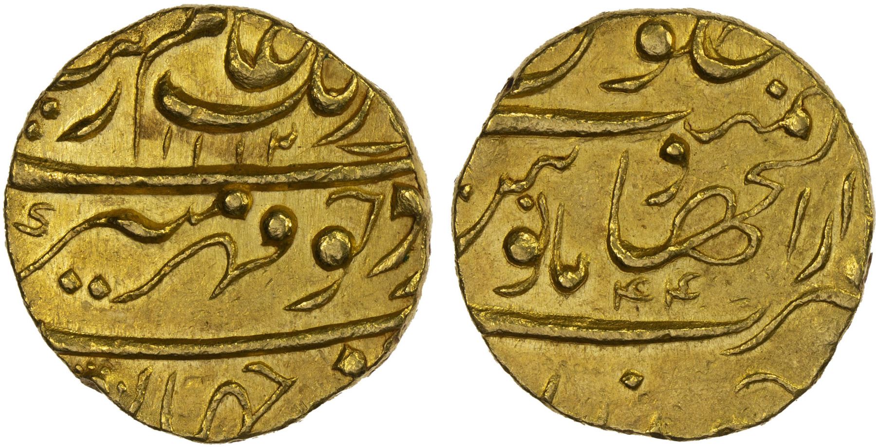 MUGHAL: Aurangzeb, 1658-1707, AV mohur (11.01g), Hyderabad, AH1112 year 44, A-315.20, with the mint epithet dar al-jihad on the obverse; bold strike, Unc.