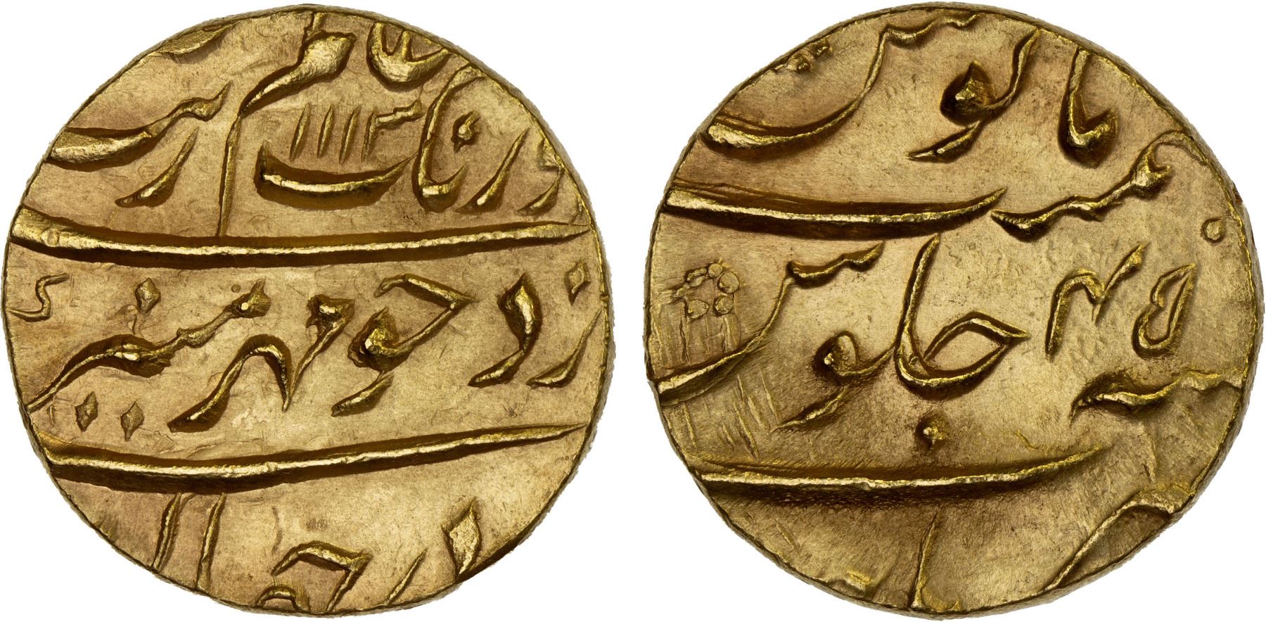 MUGHAL: Aurangzeb, 1658-1707, AV mohur (11.07g), Burhanpur, AH1113 year 45, KM-315.16, wonderful bold strike, Unc. The "scratches" on the reverse are on the die, not on the coin!
