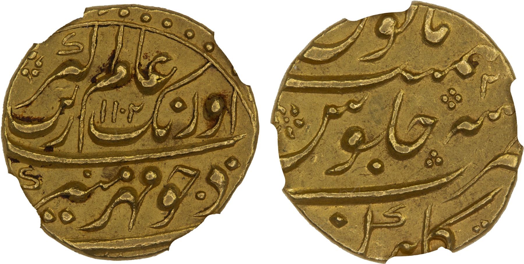 MUGHAL: Aurangzeb, 1658-1707, AV mohur, Gulbarga (Kulbarga), AH1102 year 3x, NGC AU55
