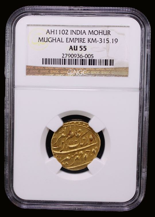 MUGHAL: Aurangzeb, 1658-1707, AV mohur, Gulbarga (Kulbarga), AH1102 year 3x, KM-315.19, gorgeous strike, without any weakness, NGC graded AU55.