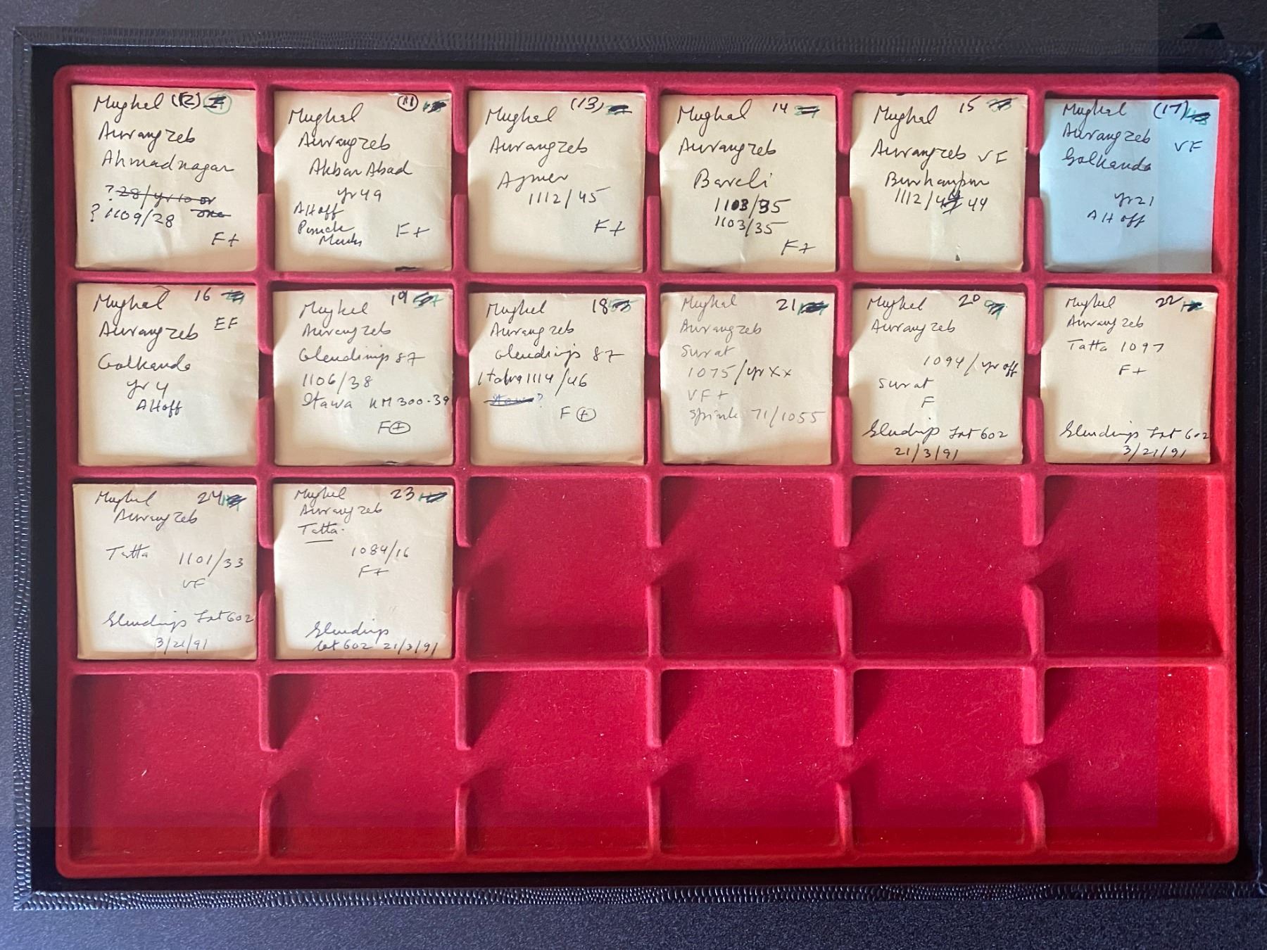 MUGHAL: Aurangzeb, 1658-1707, LOT of 14 silver rupees, including the mints of Ahmadnagar, Akbarabad, Ajmer, Bareli, Burhanpur, Golkonda (2 pcs), Itawa (2), Surat (2), and Tatta (2); average Fine condition, a few nicer, most with testmarks or other defects; all in the consignor's envelopes; retail value $385; lot of 14 pieces.