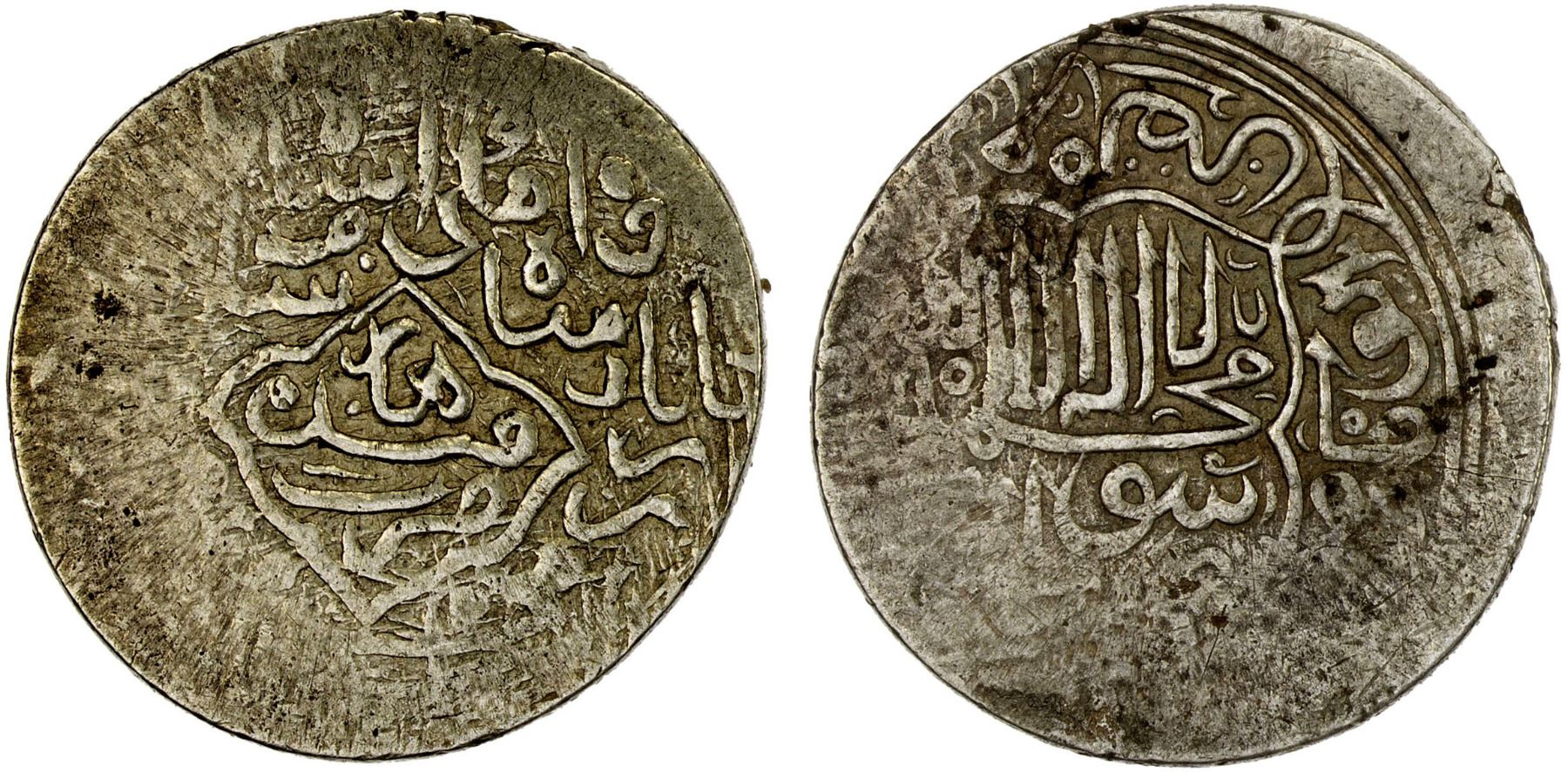 MUGHAL: Babur, 3rd reign, 1504-1530, AR shahrukhi (4.73g), Qandahar, ND, Rahman, miint in central obverse cartouche, as on the AH933 type (Rahman-38) but undated, probably struck after Babur's conquest of Qandahar in AH928 (1522); about 20% flat strike, unpublished type, VF, RRR. With the full phrase after "khulida" that translates as "and his command and his affair" (also found on the AH933 issue).