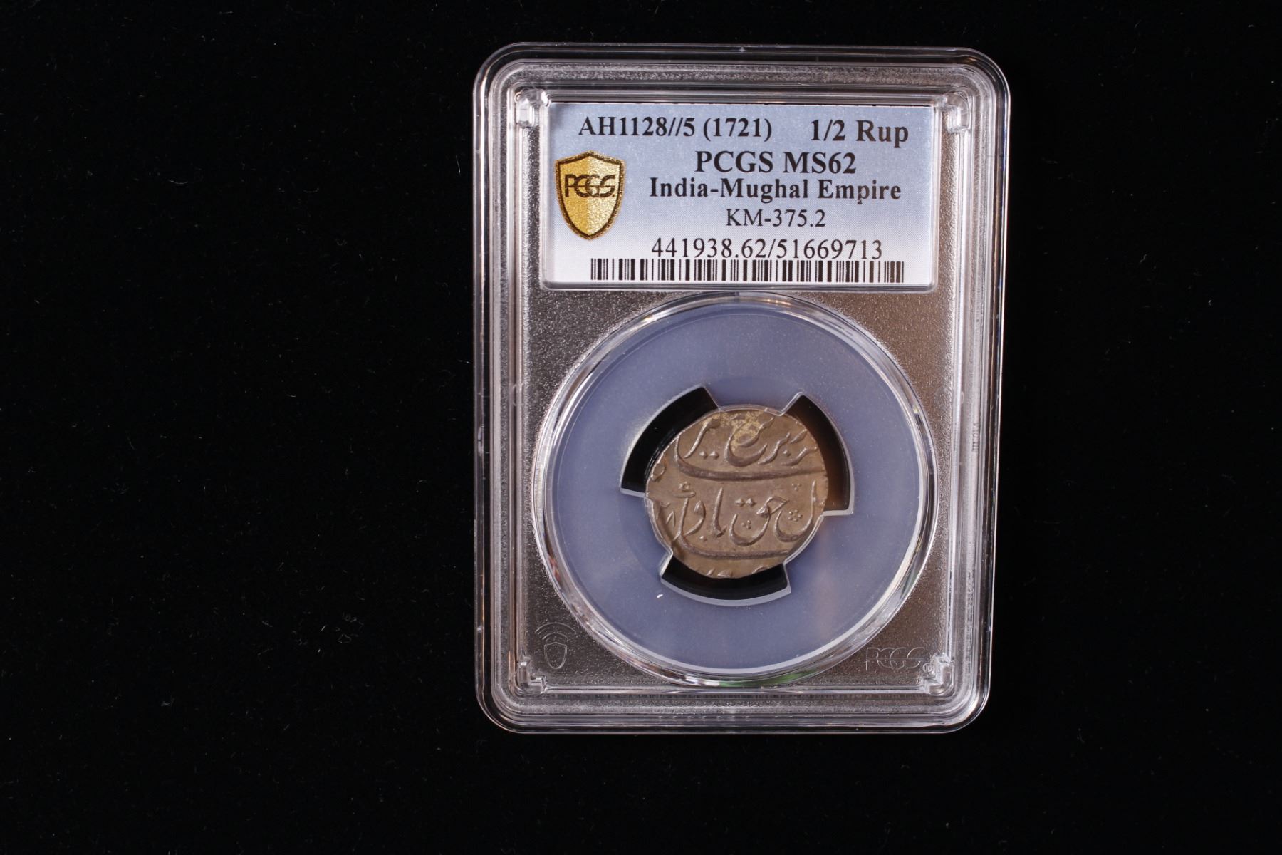MUGHAL: Farrukhsiyar, 1713-1719, AR 1/2 rupee (5.73g), Surat, AH1128 year 5, KM-375.2, a pleasing toned mint state example, PCGS graded MS62.