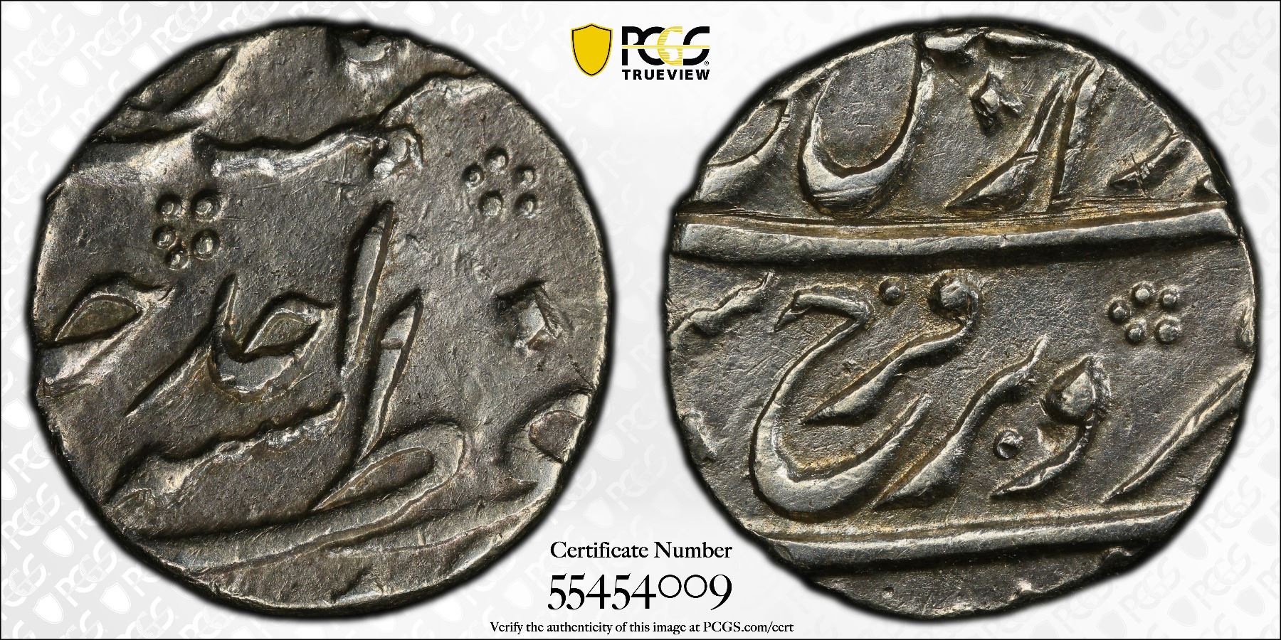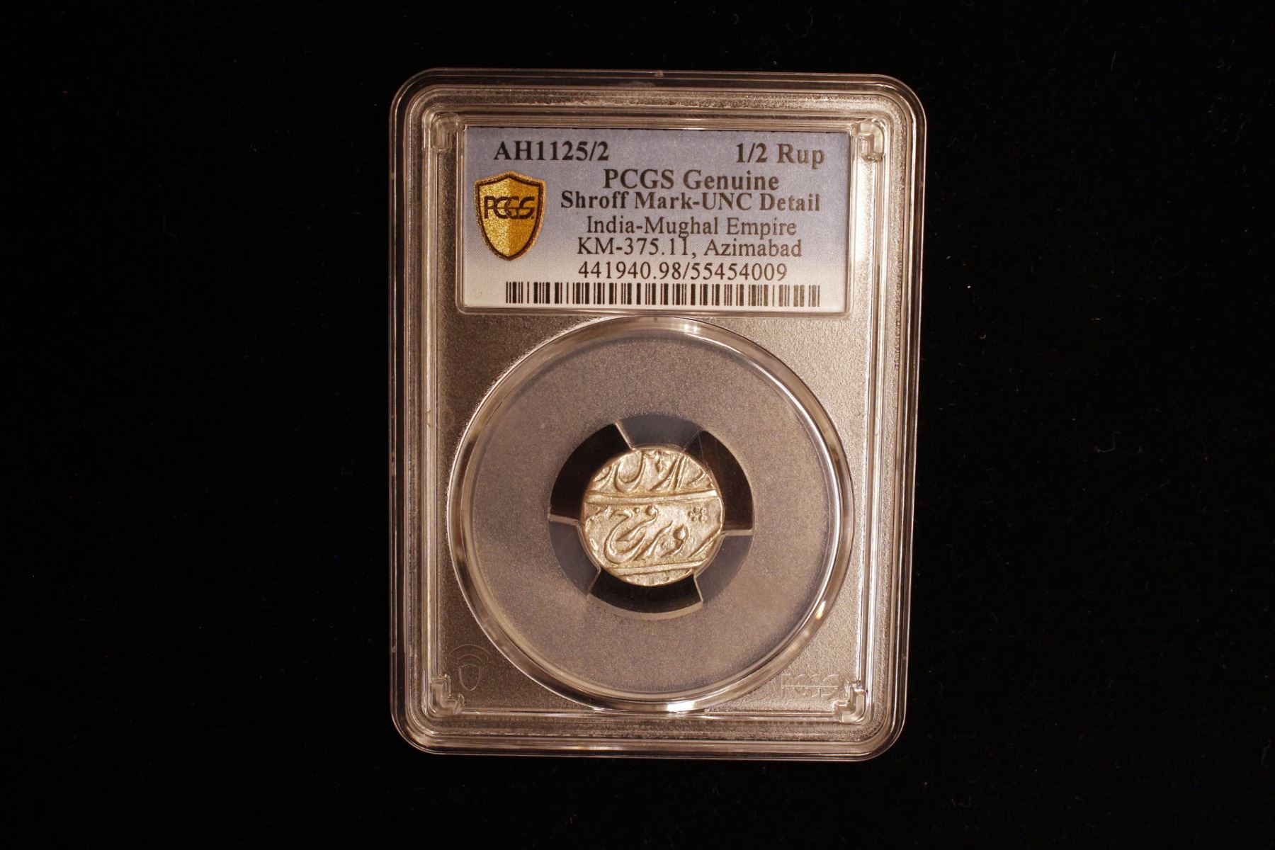 MUGHAL: Farrukhsiyar, 1713-1719, AR 1/2 rupee, Azimabad, year one (ahad), KM-375.11, shroff mark (tiny mark on the edge only), PCGS graded Unc details. Date incorrectly called AH1125/2 on the slab.