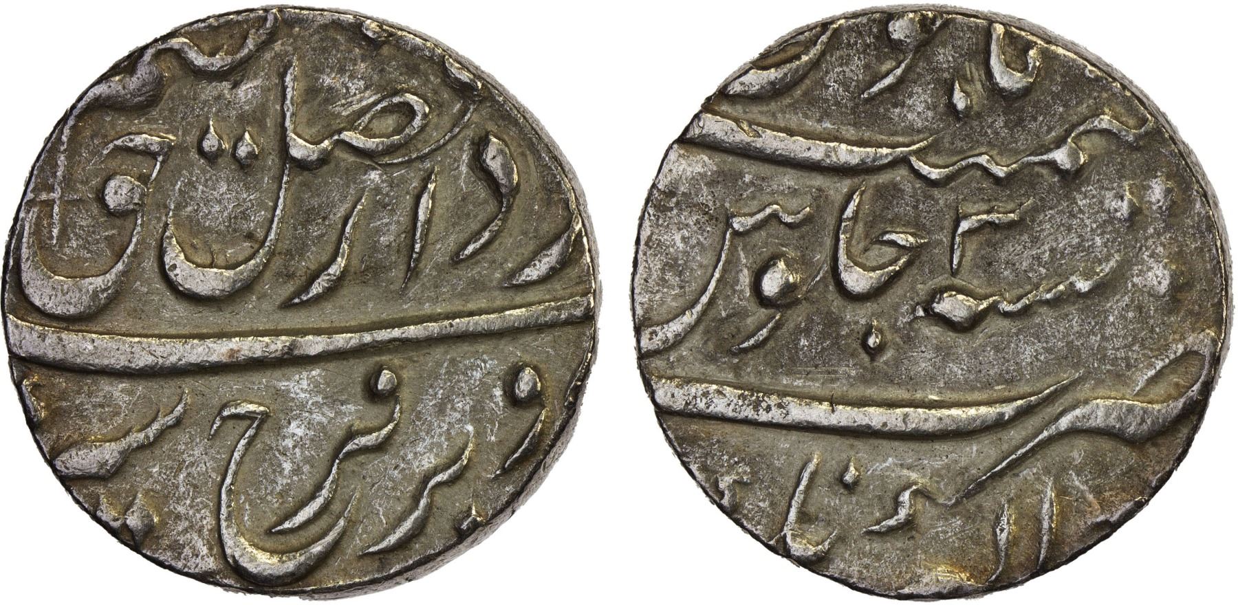 MUGHAL: Farrukhsiyar, 1713-1719, AR rupee (11.46g), Akbarnagar, year 3, KM-377.7, unusual style, with the name farrukhsiyar at the very bottom of the obverse field, without any testmarks, choice VF-XF.