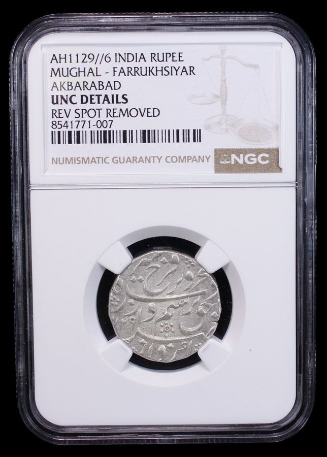 MUGHAL: Farrukhsiyar, 1713-1719, AR rupee, Akbarabad, AH1129 year 6, NGC UNC details