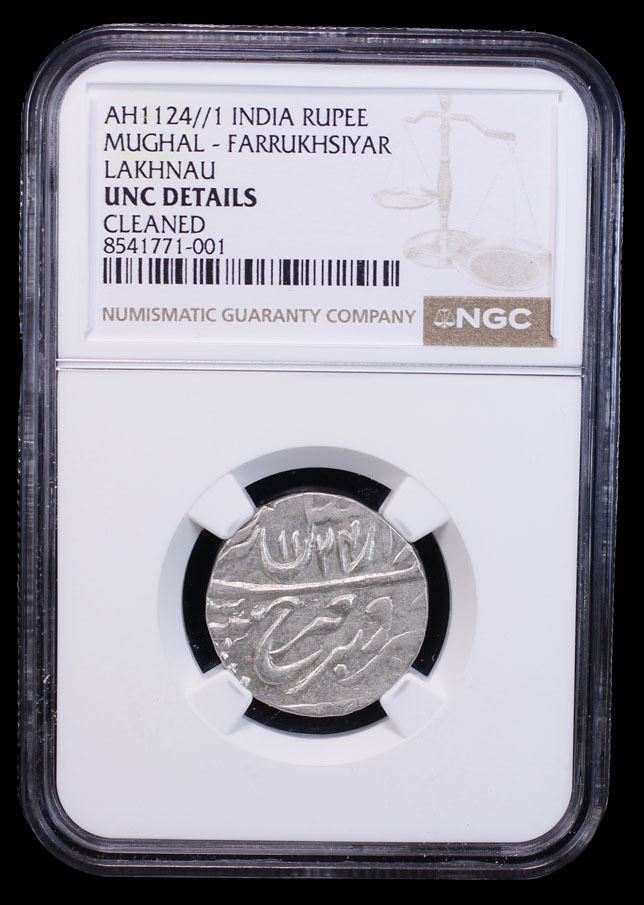 MUGHAL: Farrukhsiyar, 1713-1719, AR rupee, Lakhnau, AH1124 year one (ahad), KM-377.44, cleaned, NGC graded UNC details.