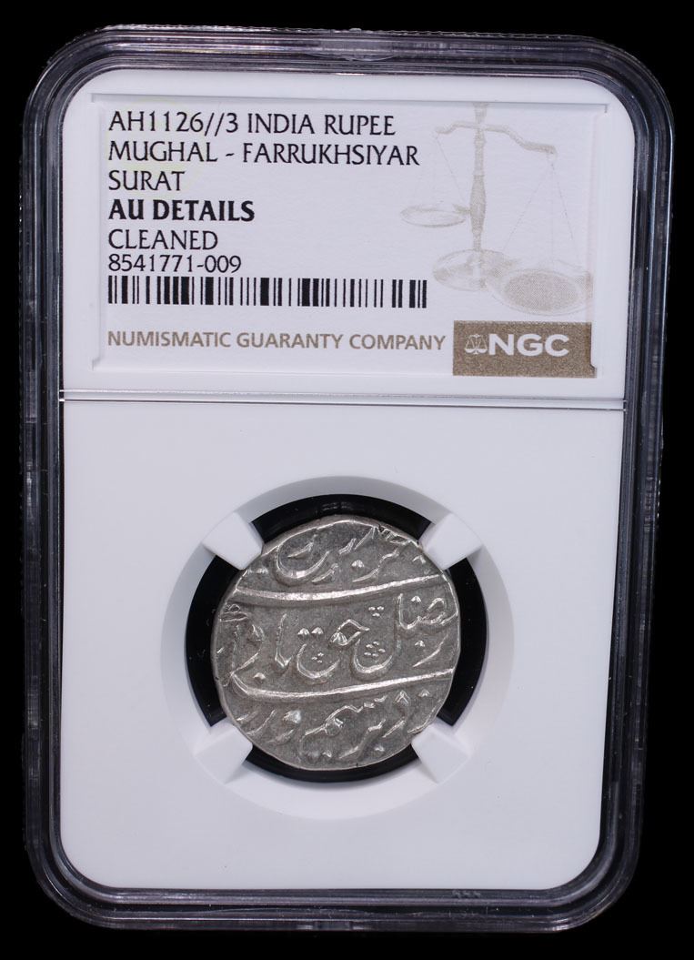 MUGHAL: Farrukhsiyar, 1713-1719, AR rupee, Surat, AH(112)6 year 3, KM-377.59, cleaned, NGC graded AU details.