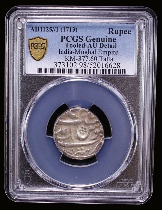 MUGHAL: Farrukhsiyar, 1713-1719, AR rupee, Tatta, AH1125 year 1, PCGS AU details