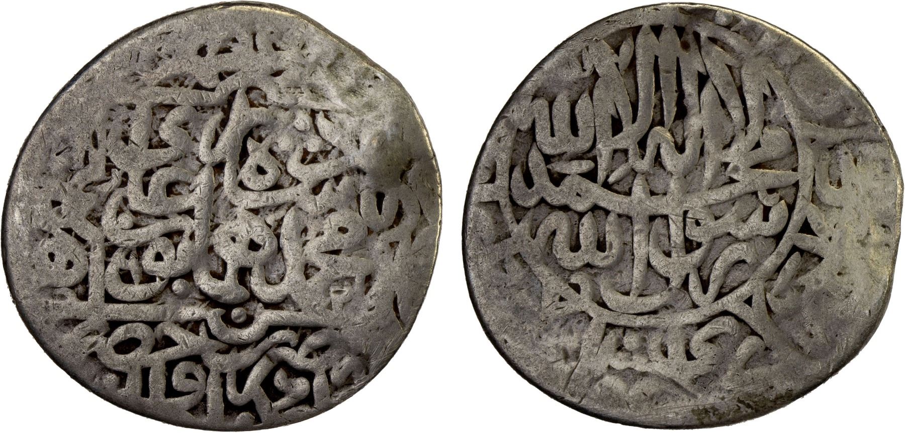 MUGHAL: Humayun, 1530-1556, AR shahrukhi (4.38g), Hadrat Delhi, AH(9)62 (in tiny numerals), Zeno-115540 (dated AH962), struck during his 2nd reign, 1554-1556: royal titles in the central area, muhammad humayun padshah ghazi, mint formula below // the kalima in the central circle, the Rashidun named in the margin, no testmarks, VG, RRR. Only 2 examples filed on CoinArchives, one undated (sold in our Auction 34, lot 2457) and one dated AH963; just one on Zeno, dated AH962.