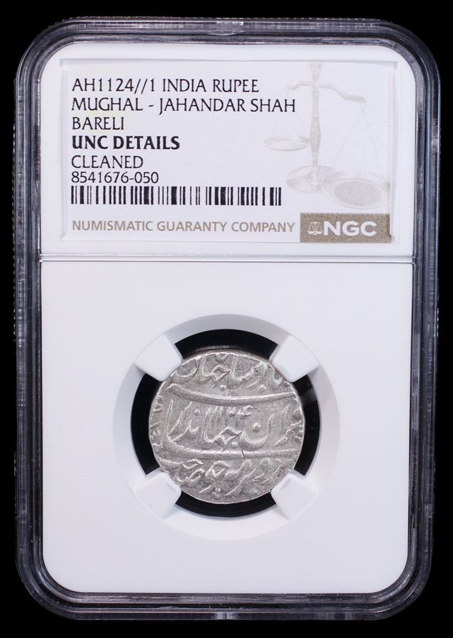 MUGHAL: Jahandar, 1712-1713, AR rupee, Bareli, AH1124 year one (ahad), KM-364.7, fantastic bold strike; cleaned, NGC graded UNC details.