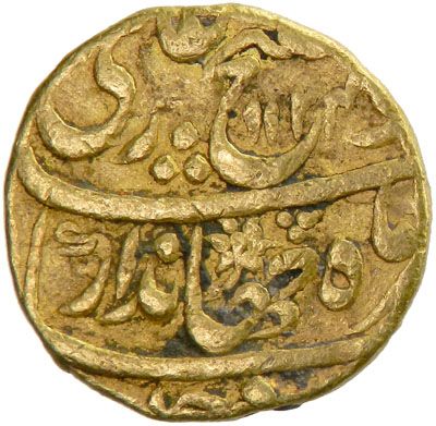 MUGHAL: Jahandar, 1712-1713, AV mohur (10.84g), Akbarabad, AH1124 year one (ahad), KM-368.1, with mint epithet mustaqirr al-mulk, Fine to VF.