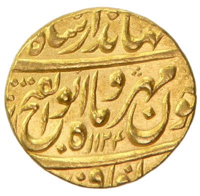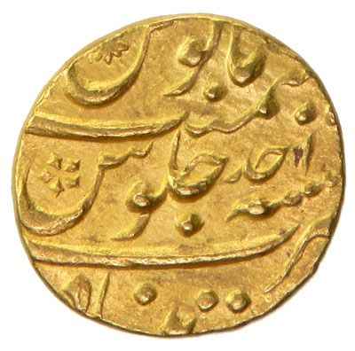 MUGHAL: Jahandar, 1712-1713, AV mohur (10.95g), Khujista Bunyad (Aurangabad), AH1124 year one (ahad), KM-368.5, bold strike, choice EF.