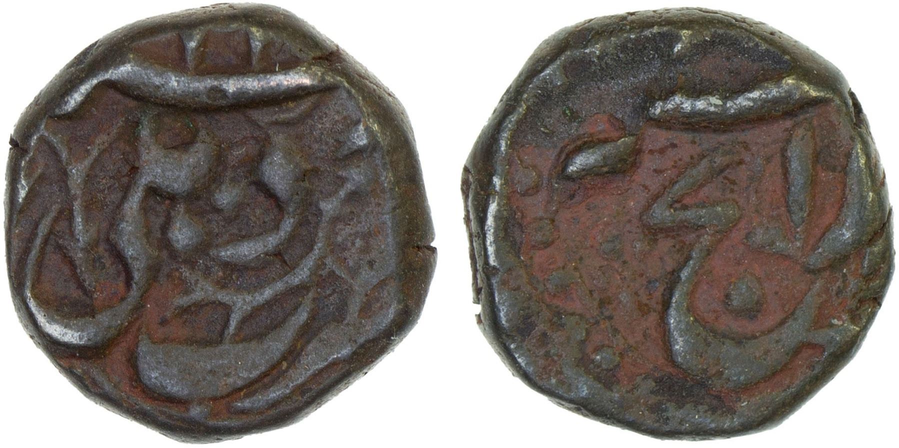 MUGHAL: Jahangir, 1605-1628, AE 1/2 rayej (= 1/8 dam) (2.53g), Delhi, ND, KM-, citing the mint with traces of a Hijri date above // the words (nim) rayej sana with traces of a regnal year above, VF, RR.