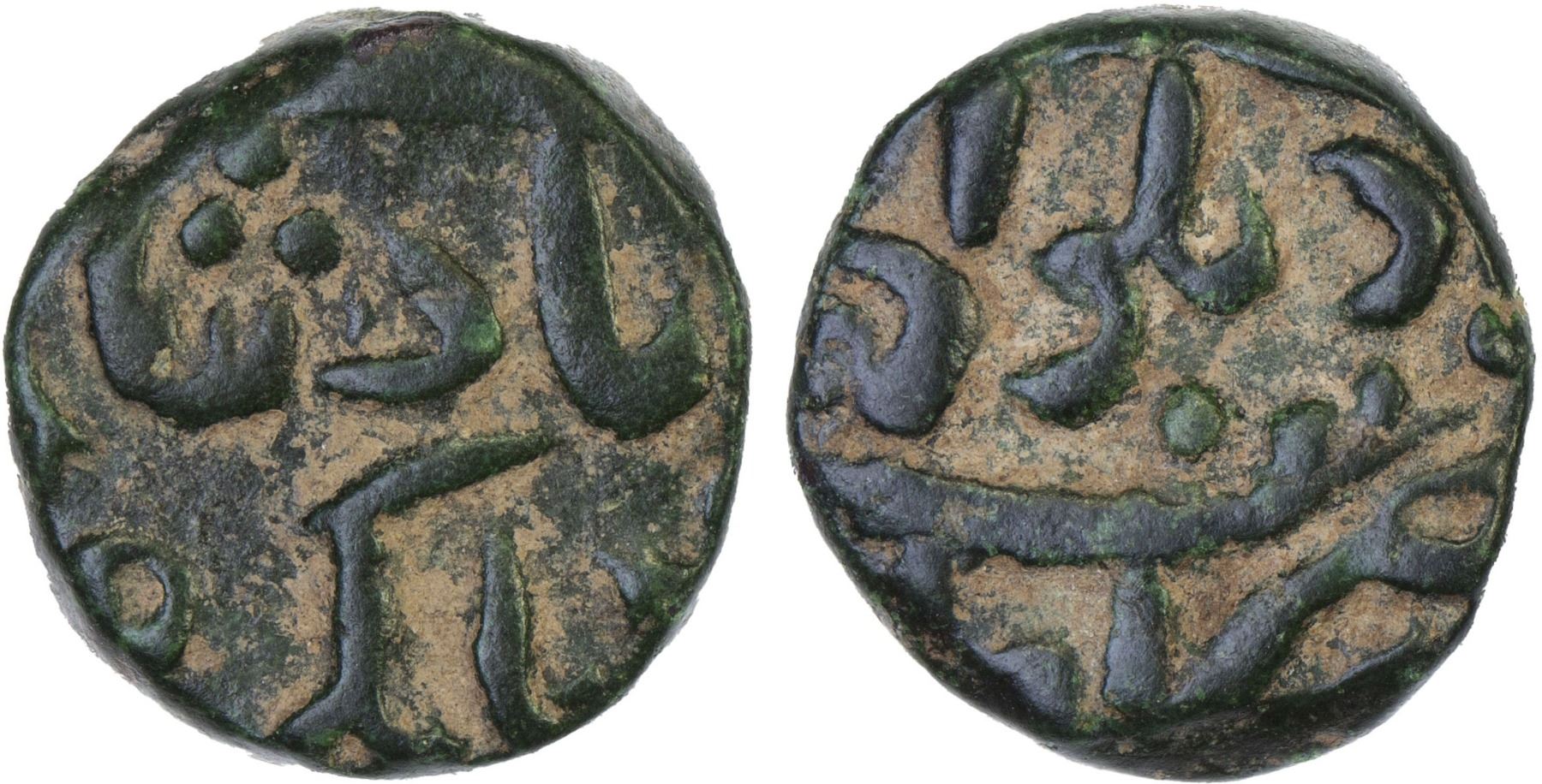 MUGHAL: Jahangir, 1605-1628, AE 1/3 dokdo (3.19g), Delwara, ND, KM-, emperor's name // mint formula, VF, RR. The denomination name is tentative, known in 2 levels, the full dokdo of about 9.15g and the 1/3 dokdo of about 3.05g; this is one of the finest examples known for this mint, located near Diu in Gujarat.