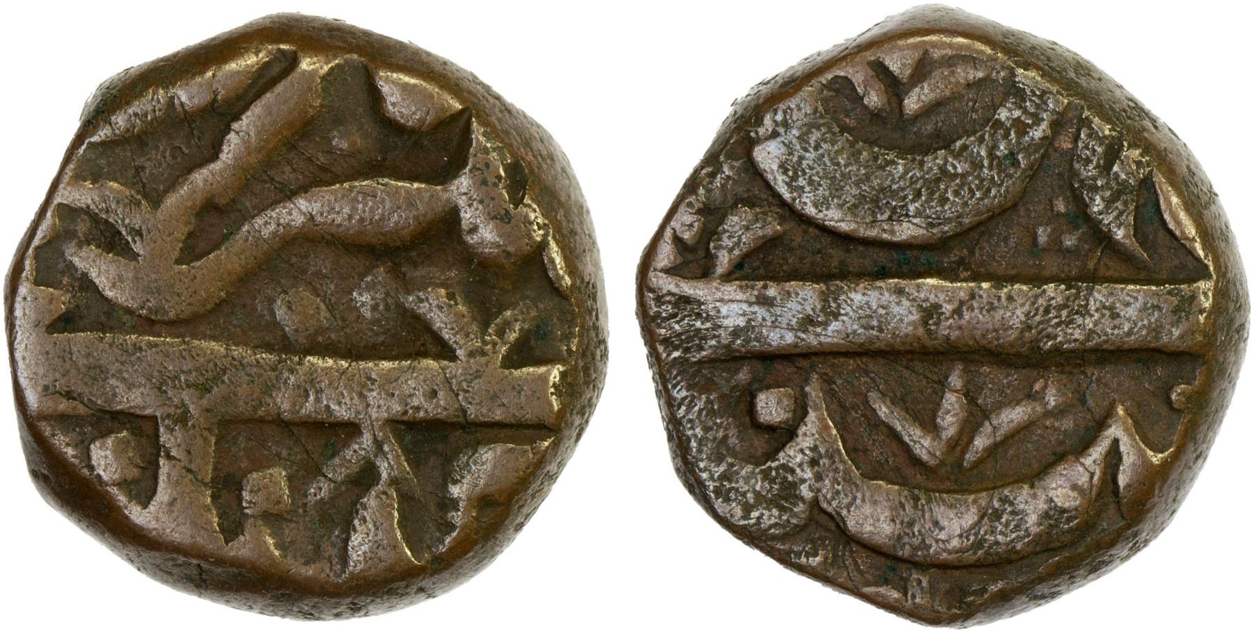 MUGHAL: Jahangir, 1605-1628, AE 2/3 falus (9.55g), Ahmadnagar, AH"1002" (off flan), KM-124.4, Zeno-140279, actually struck after AH1014, the accession year of Jahangir, to the denomination used at Ahmadnagar by Nizam Shah dynasty, strong VF, R.