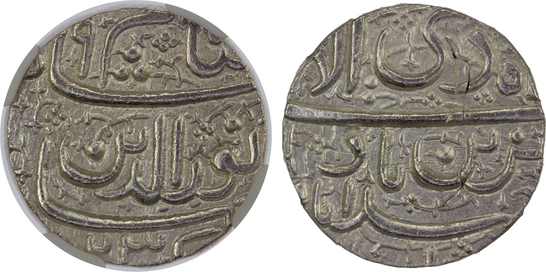 MUGHAL: Jahangir, 1605-1628, AR rupee, Ahmadnagar, ND, KM-149.2, "Muzaiyan" series; month of Di, magnificient example with perfect strike! NGC graded MS63.