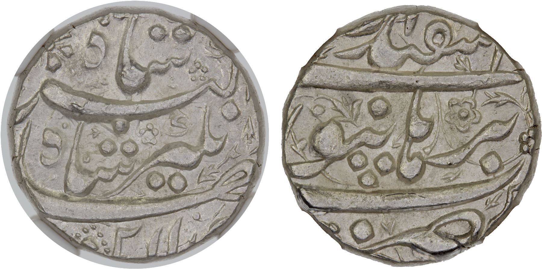 MUGHAL: Jahangir, 1605-1628, AR rupee, Burhanpur, ND, KM-145.5, month of Isfandarmuz; fantastic example, wth some original luster, NGC graded MS64.