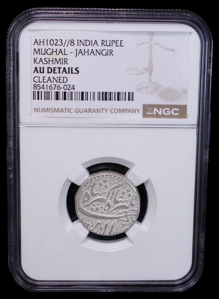 MUGHAL: Jahangir, 1605-1628, AR rupee, Kashmir, AH1023 year 8, KM-145.10, month of Isfandarmuz; bold strike; cleaned, NGC graded AU details.