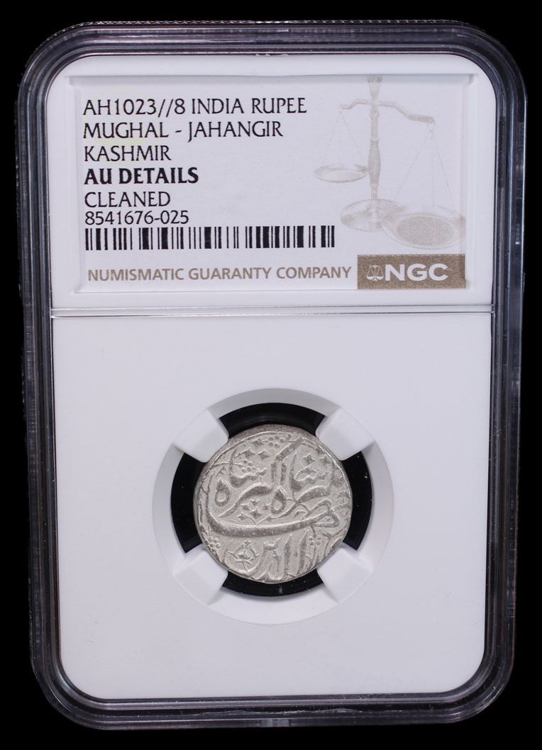 MUGHAL: Jahangir, 1605-1628, AR rupee, Kashmir, AH1023 year 8, KM-145.10, month of Isfandarmuz; bold strike; cleaned, NGC graded AU details.