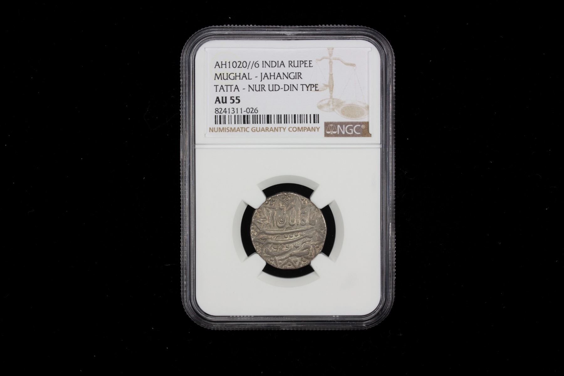 MUGHAL: Jahangir, 1605-1628, AR rupee, Tatta, AH1020 year 6, KM-145.17, Nur al-Din type, beautifully centered, NGC graded AU55.