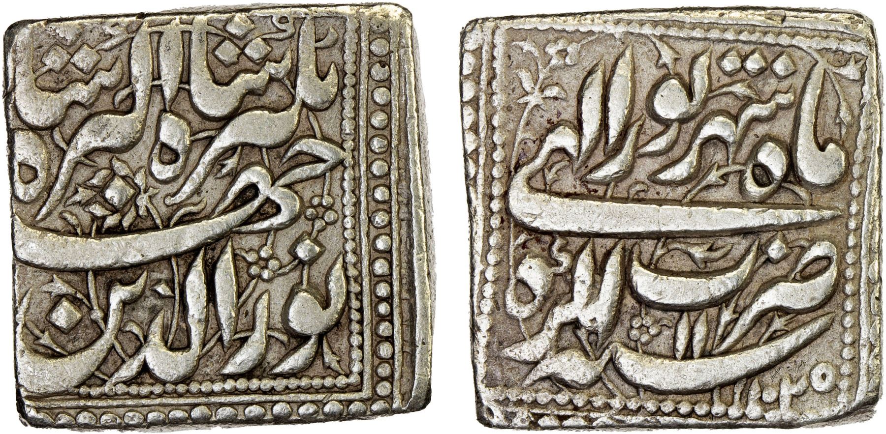 MUGHAL: Jahangir, 1605-1628, AR square rupee (11.24g), Agra, AH1025 year 11, KM-147.2, month of Shahrewar; bold strike without any testmarks or other flaws, wonderful example! VF-XF.