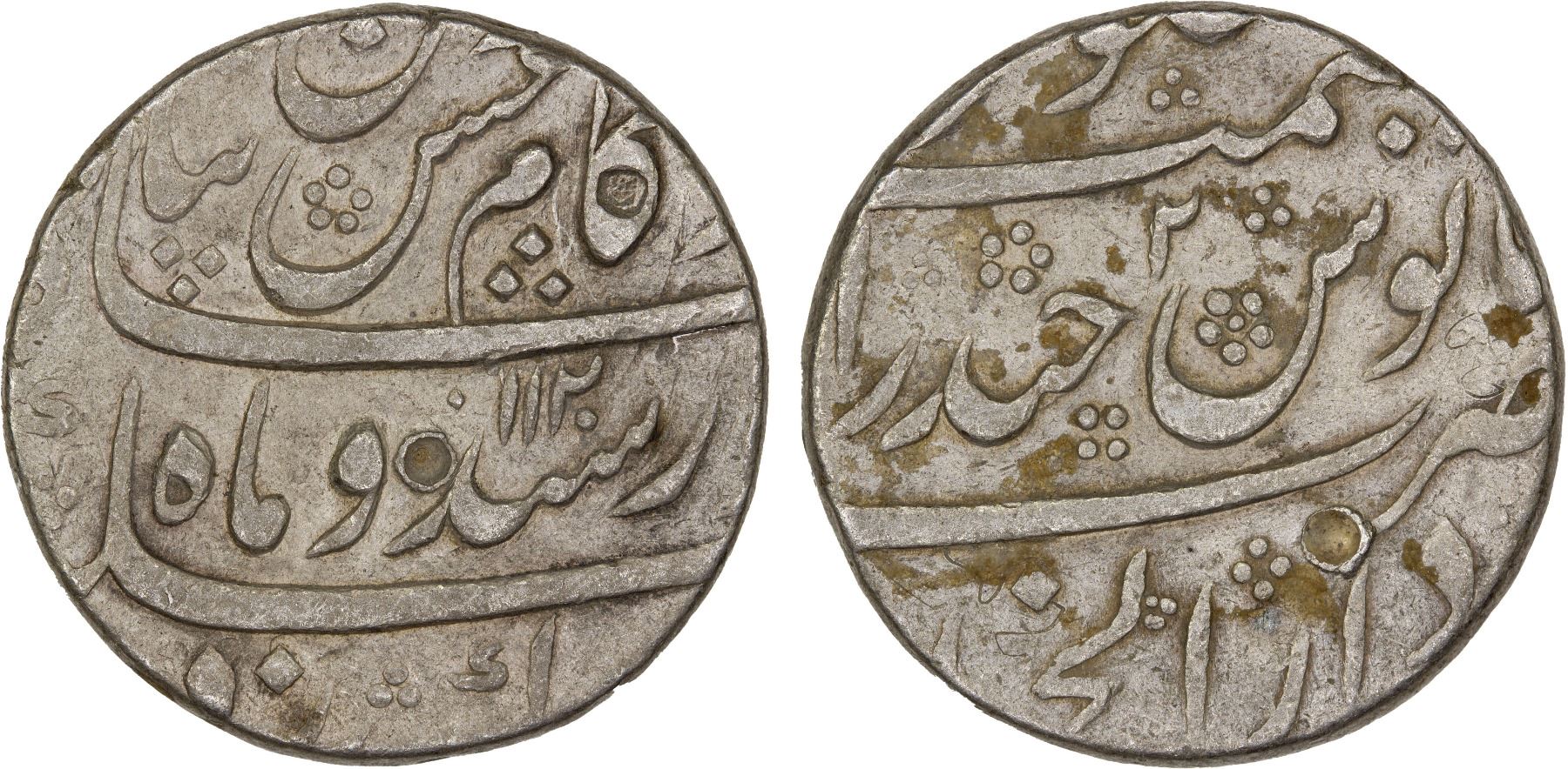 MUGHAL: Kam Bakhsh, 1707-1708, AR rupee (11.47g), Haiderabad, AH1120 year 2, KM-336.5, with the rhyming epithet Dar al-Jihad; 2 testmarks, bold strike on slightly broad flan, VF-XF, RR.
