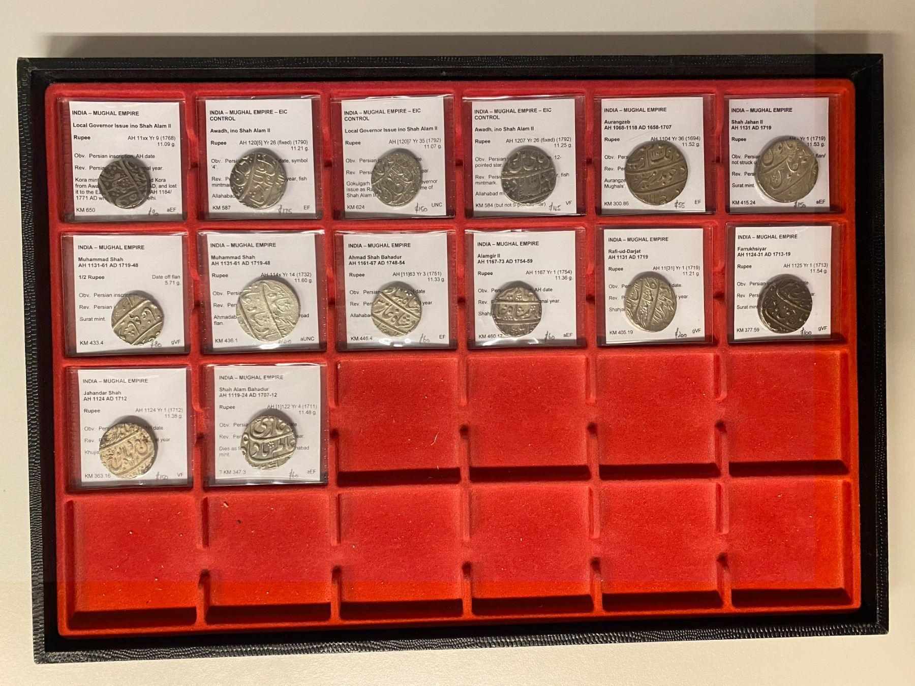 MUGHAL: LOT of 13 silver rupees and 1 half rupee, including Aurangzeb (1, Surat mint); Shah Alam I (1, Allahabad); Jahandar (1, Khujista Bunyad); Farrukhsiyar (1, Surat); Rafi-ud-Darjat (1, Shahjahanabad, porous surfaces); Shah Jahan II (1, Surat, VF); Muhammad Shah, 1/2 rupee (1, Surat), and rupee (1, Ahmadabad); Ahmad Shah (1, Allahabad); Alamgir II (1, Shahjahanabad); and Shah Alam II (4, local issues from Kora, Gokulgarh, and two from Allahabad); mostly VF to EF grades, a few less; all with Todd's description; retail value $550, lot of 14 pieces, ex Ian Todd Collection.
