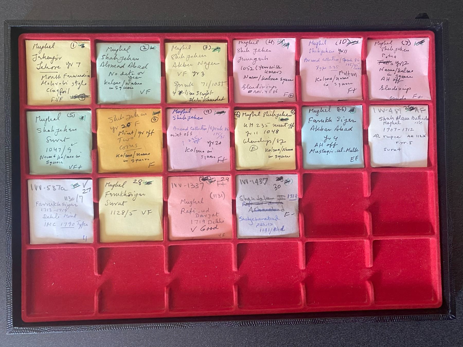 MUGHAL: LOT of 16 silver rupees, including Jahangir: (1 pc) Lahore (F-VF, 2 testmarks); Shah Jahan I: (9) mints of Ahmadabad, Ahmadnagar, Junagadh, Multan, Patna, Surat, and 3 pcs with mint off; average F-VF, but almost all with testmarks, adhesions, etc.; Shah Alam I (1), Surat (Fine); Farrukhsiyar: (3) Akbarabad, Shahjahanabad, Surat (VF, stained or testmarks); Rafi-ud-Darjat: (1) Shahjahanabad (VG, 1 testmark & encrustation); and Shah Jahan II: (1) Shahjahanabad (Fine, corroded); all in the consignor's envelopes; retail value $360; lot of 16 pieces.