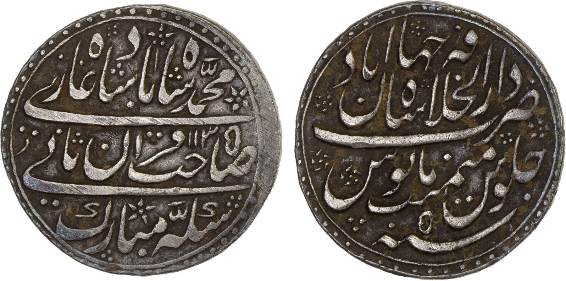 MUGHAL: Muhammad Shah, 1719-1748, AR nazarana rupee (11.31g), Shahjahanabad (Delhi), AH1135 year 5, KM-437B.2 (27mm) struck on broad flan and fully centered, with outer border of dots, choice VF. Nearly all examples of this type are dated year 5, either AH1135 or 1136; also known for AH1143 year 13.