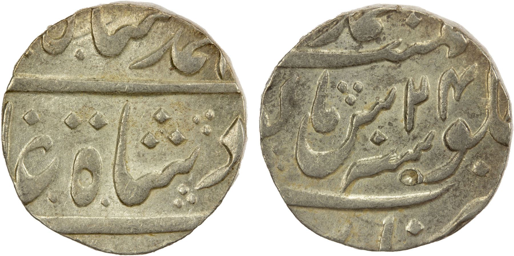 MUGHAL: Muhammad Shah, 1719-1748, AR rupee (11.38g), Muhammadabad Banaras, year 24, KM-436.15, single shroff mark, lustrous fields, AU. From a small hoard of high quality examples, nearly mint state, all dated regnal years 24 to 31.