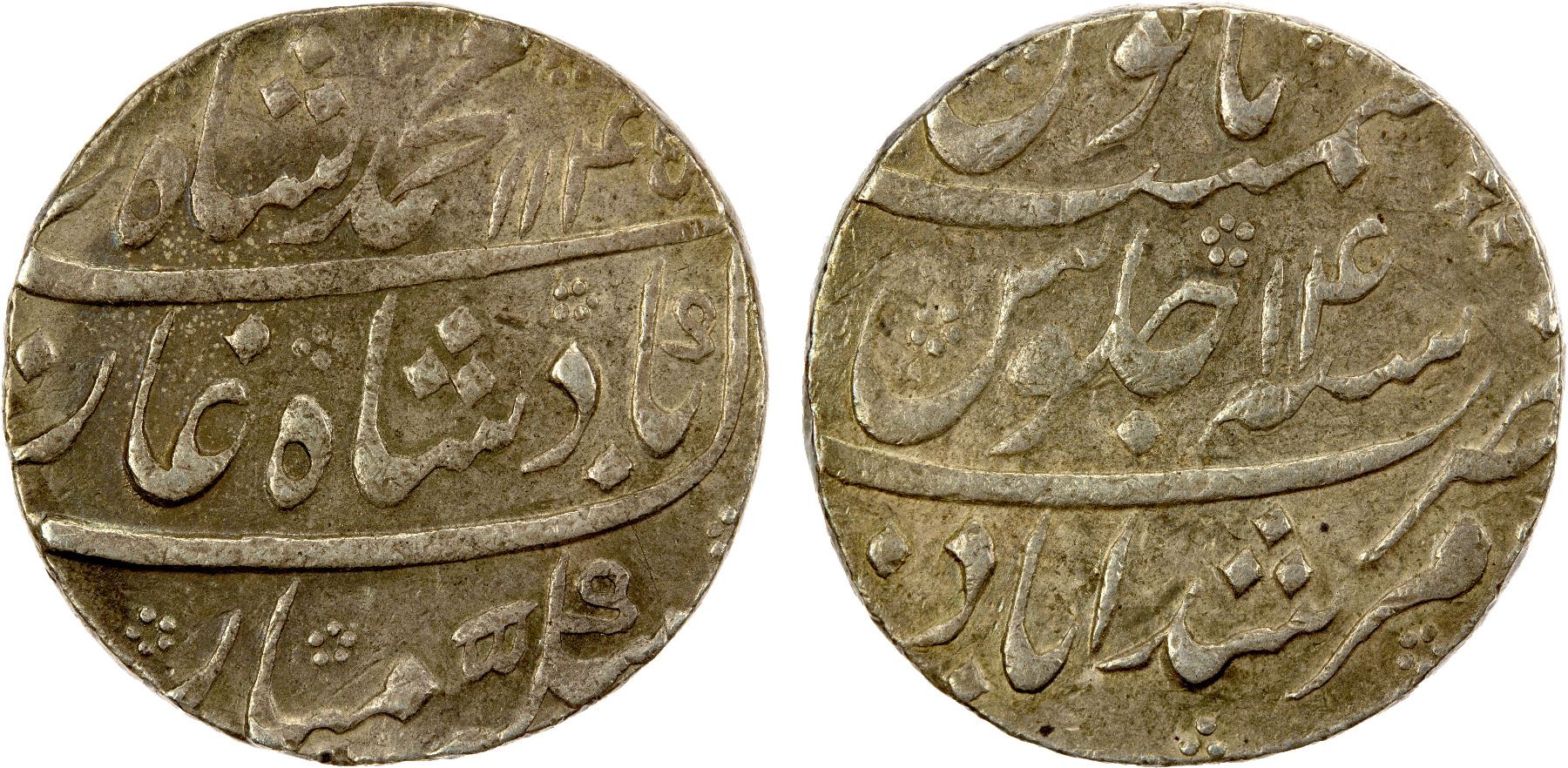 MUGHAL: Muhammad Shah, 1719-1748, AR rupee (11.64g), Murshidabad, AH1145 year 14, KM-436.46, full mint and both dates, scarce in this quality, EF, ex Paul Stevens Collection.