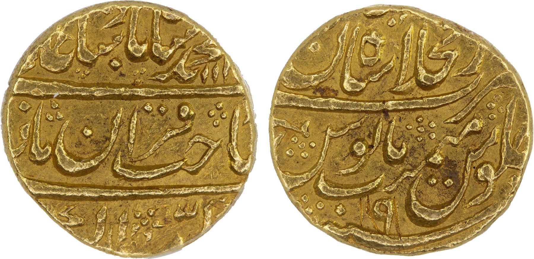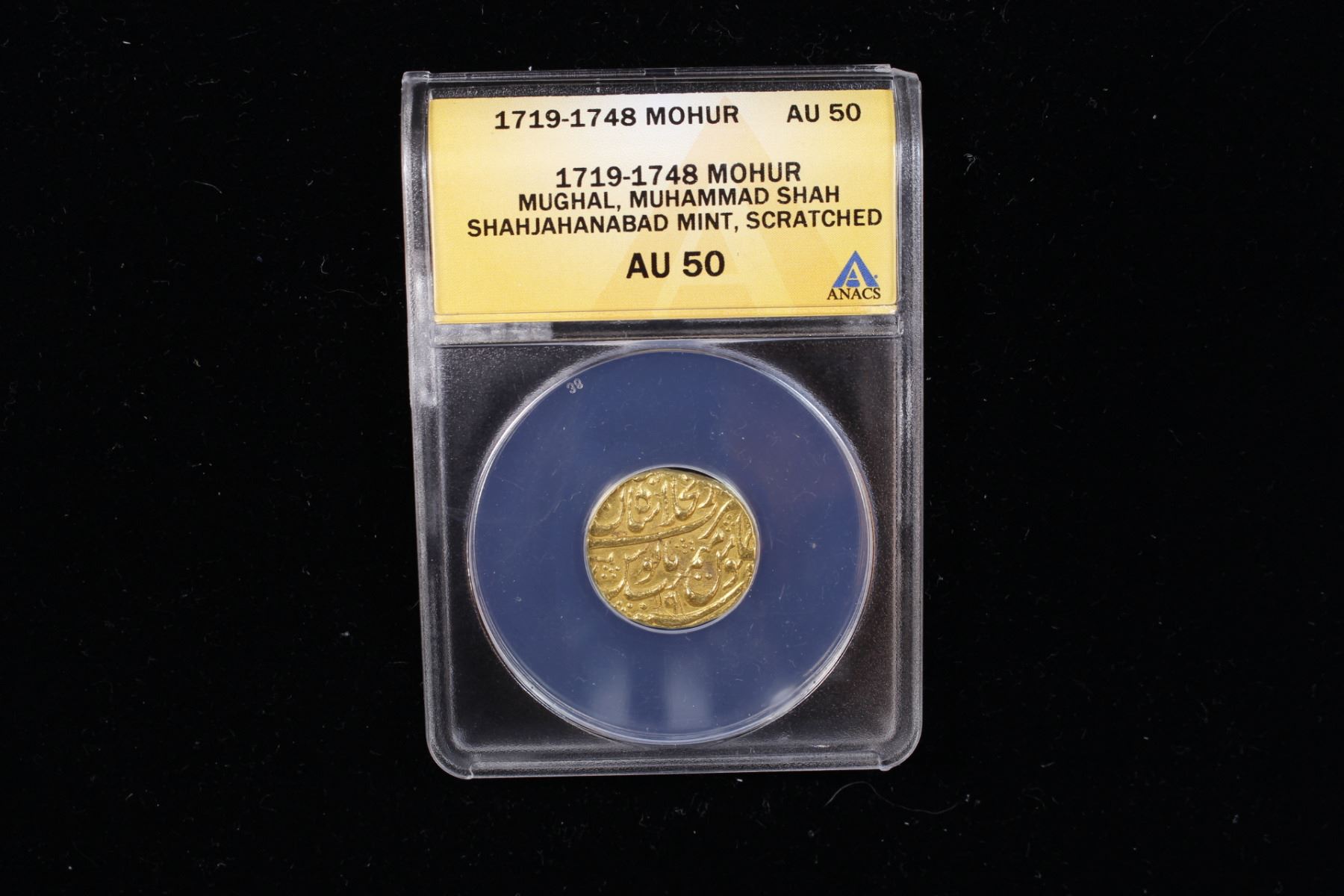 MUGHAL: Muhammad Shah, 1719-1748, AV mohur, Shahjahanabad (Delhi), AH114x year 19, KM-439.4, ANACS graded AU50.
