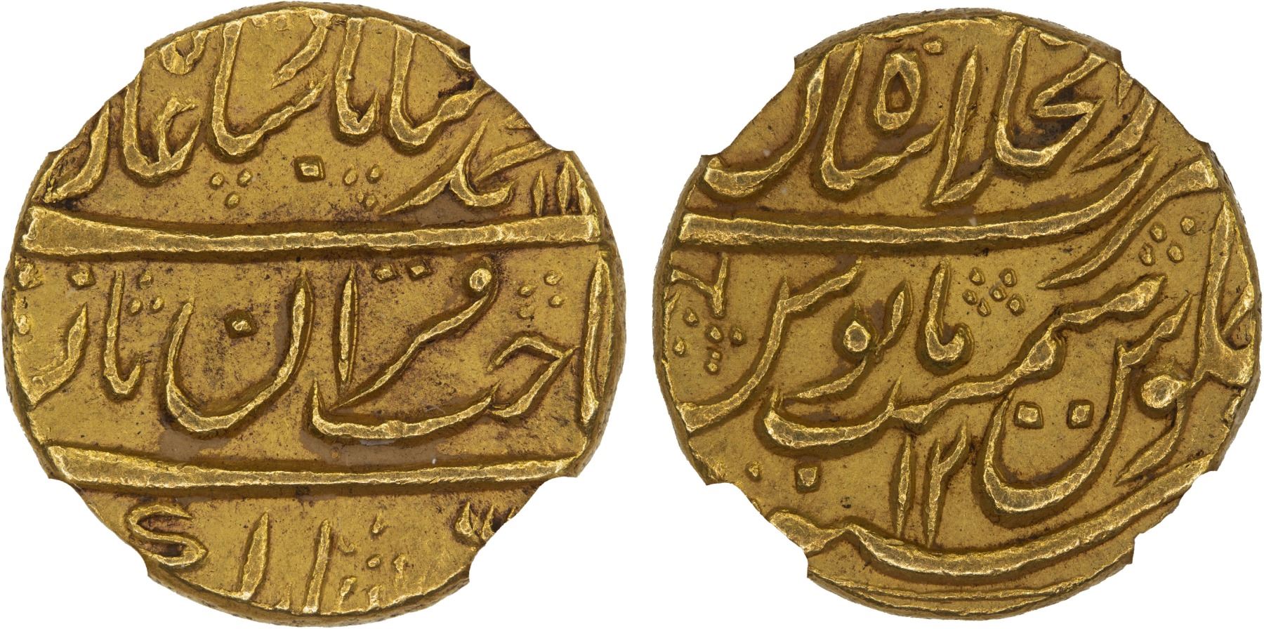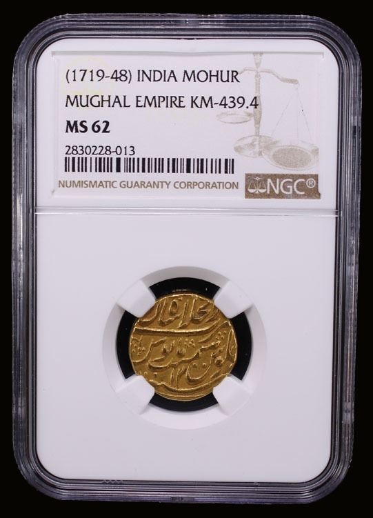 MUGHAL: Muhammad Shah, 1719-1748, AV mohur, Surat, year 12, KM-439.4, NGC graded MS62.