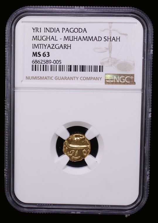 MUGHAL: Muhammad Shah, 1719-1748, AV pagoda, Imtiyazgarh, AH(11)31 year one (ahad), KM-E440.1, wonderful strike, NGC graded lustrous MS63, R.