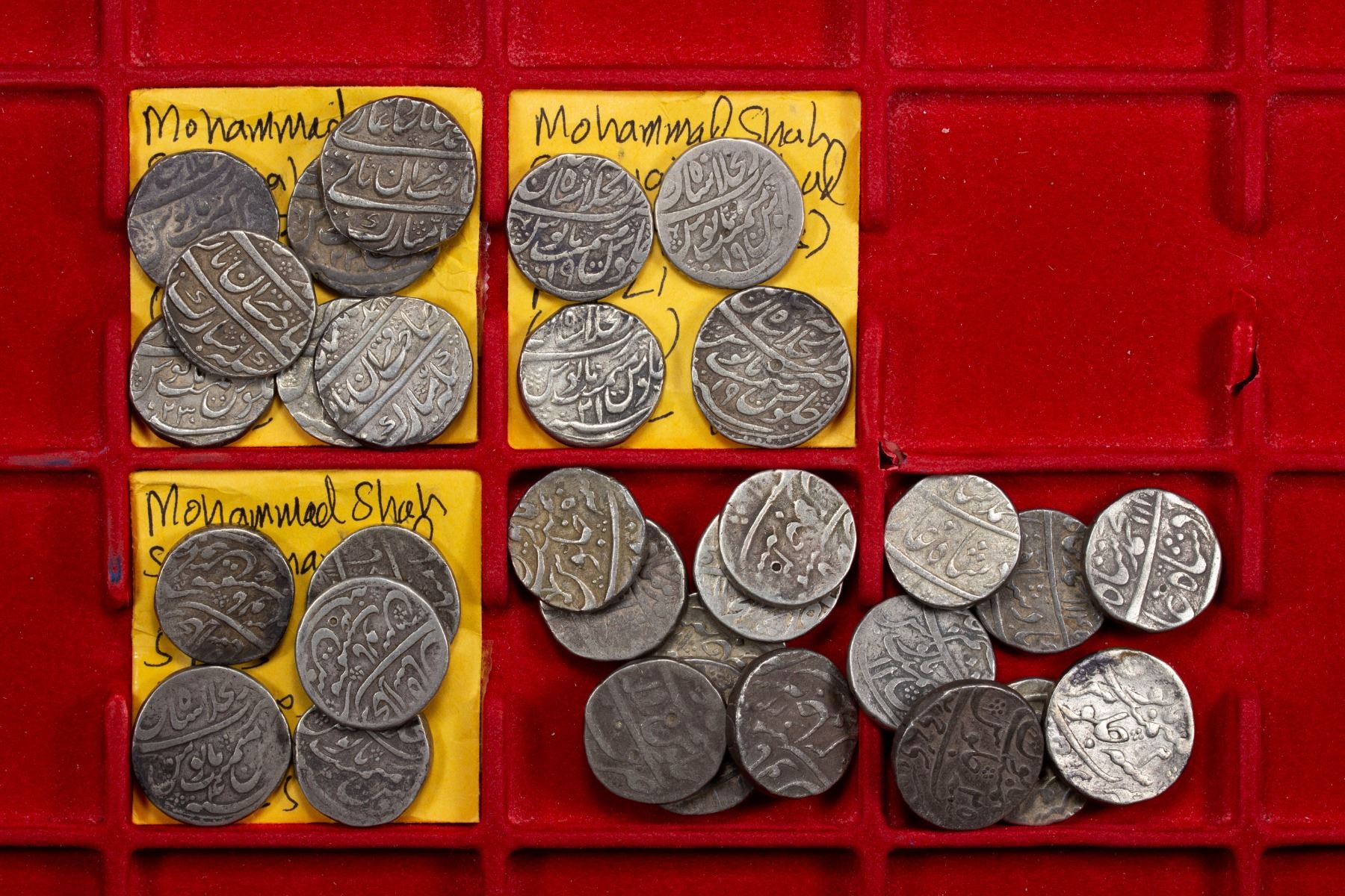 MUGHAL: Muhammad Shah, 1719-1748, LOT of 31 silver rupees, includes 16 pieces of the common type of Shahjahanabad with legble mint and a few with legible regnal yeaer, plus 15 pieces without mint name according to the consignor but a few show at least part of the mint name; average Fine to VF, a few with minor flaws; retal value $600. lot of 31 pieces.