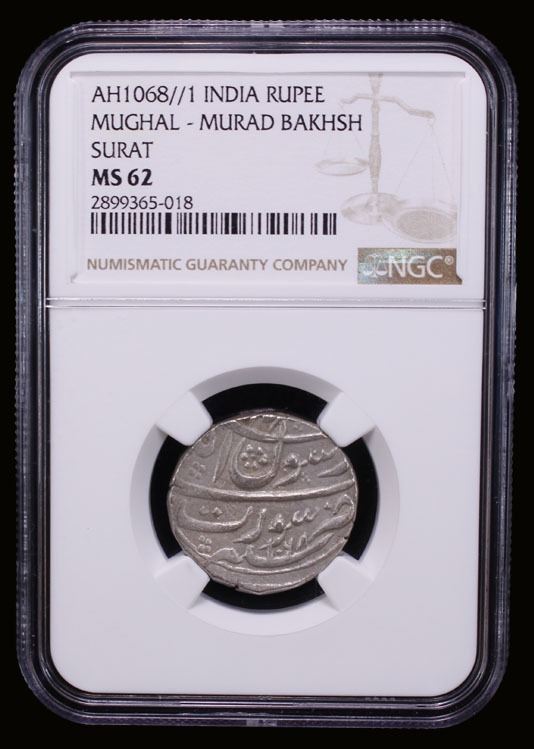 MUGHAL: Murad Bakhsh, 1658, AR rupee, Surat, AH1068 year one (ahad), KM-271.1, bold strike, surely one of the finest examples of this mint, clear date below the mint name and clear regnal year at the bottom of the obverse, NGC graded MS62, RR.