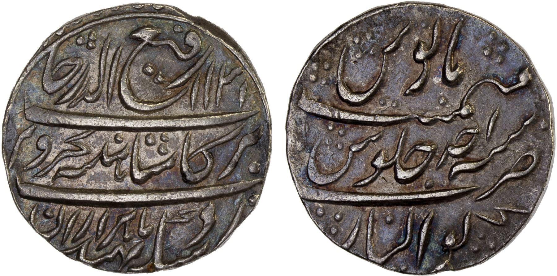 MUGHAL: Rafi-ud-Darjat, 1719, AR rupee (11.36g), Gwalior, AH1131 year one (ahad), KM-405.7, lovely strike, iridescent toning, choice XF.