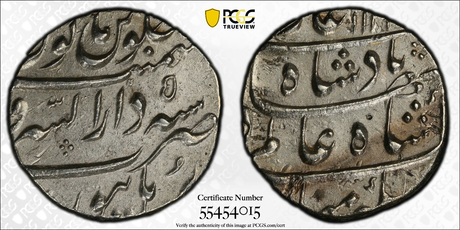 MUGHAL: Shah Alam Bahadur, 1707-1712, AR rupee, Burhanpur, AH1123 year 5, KM-348.14, superb bold strike; edge damage (not visible in the slab!), PCGS graded Unc details. The mint name is incorrectly called Bahadur on the slab.