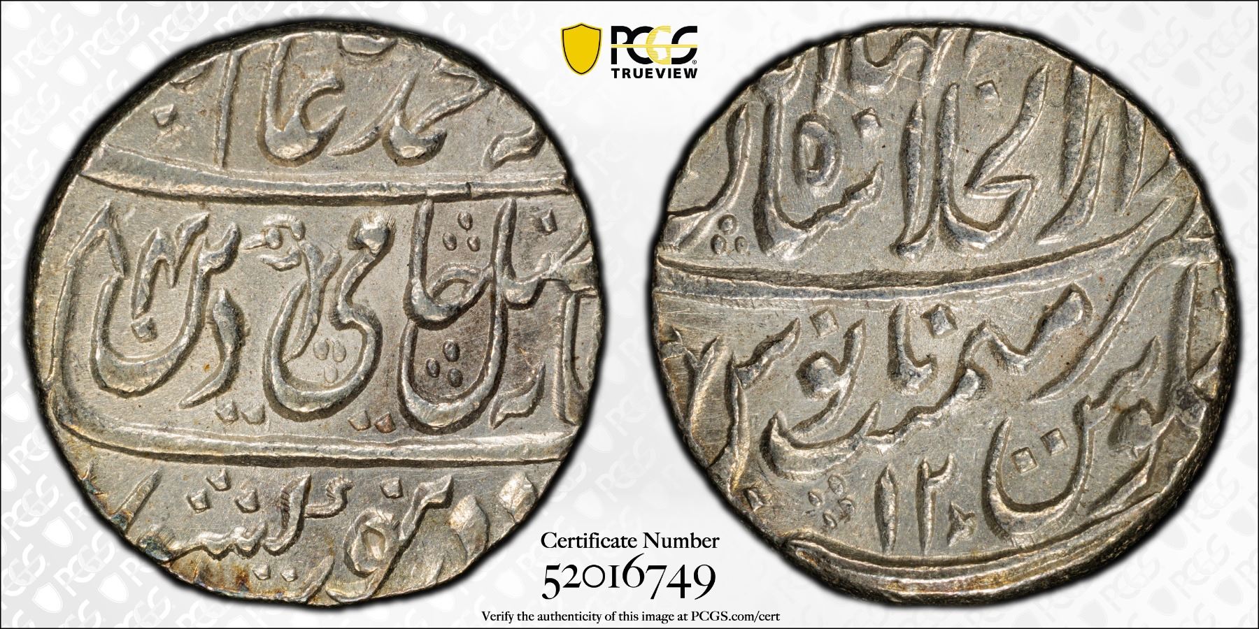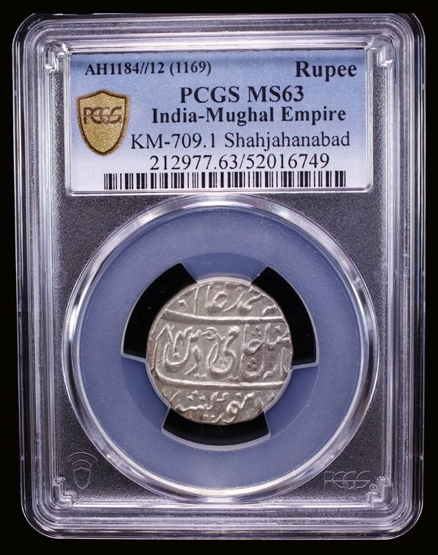 MUGHAL: Shah Alam II, 1759-1806, AR rupee (11.35g), Shahjahanabad, AH1184 year 12, KM-709, a lovely lustrous mint state example! PCGS graded MS63.